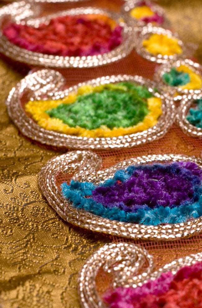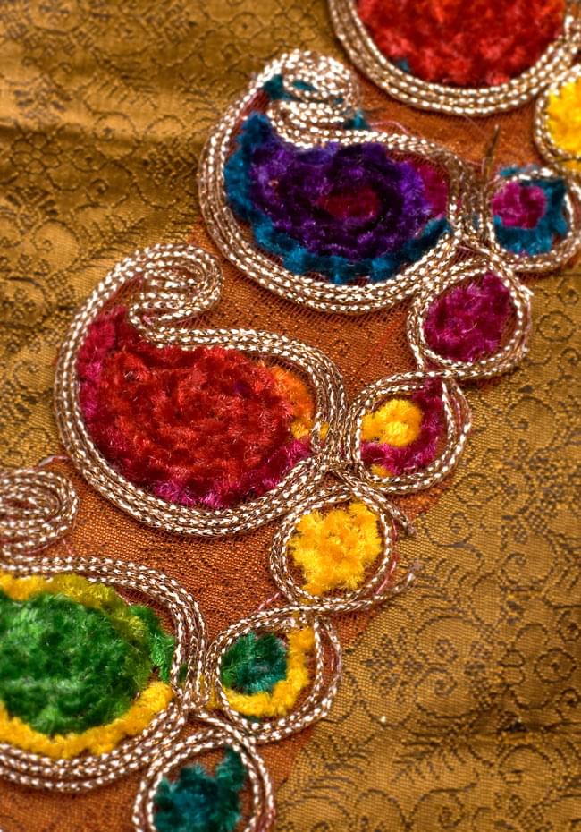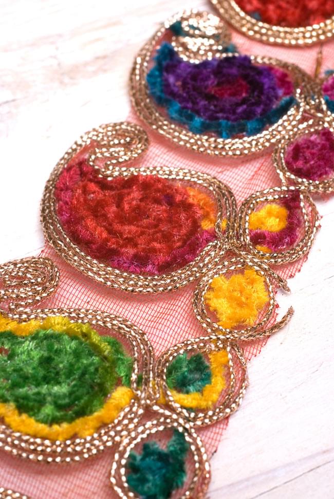 インド人はサリーのすそがボロボロにならないよう、サリーがより綺麗に見えるようにサリーの下の部分、地面に当たる部分に縫い付けて使います。「チロリアン」とはもともとヨーロッパの地方名に由来しているのですが、インドではサリーを飾るために特に独自の発展を遂げてきました。■縫い付けても、ギフトにも