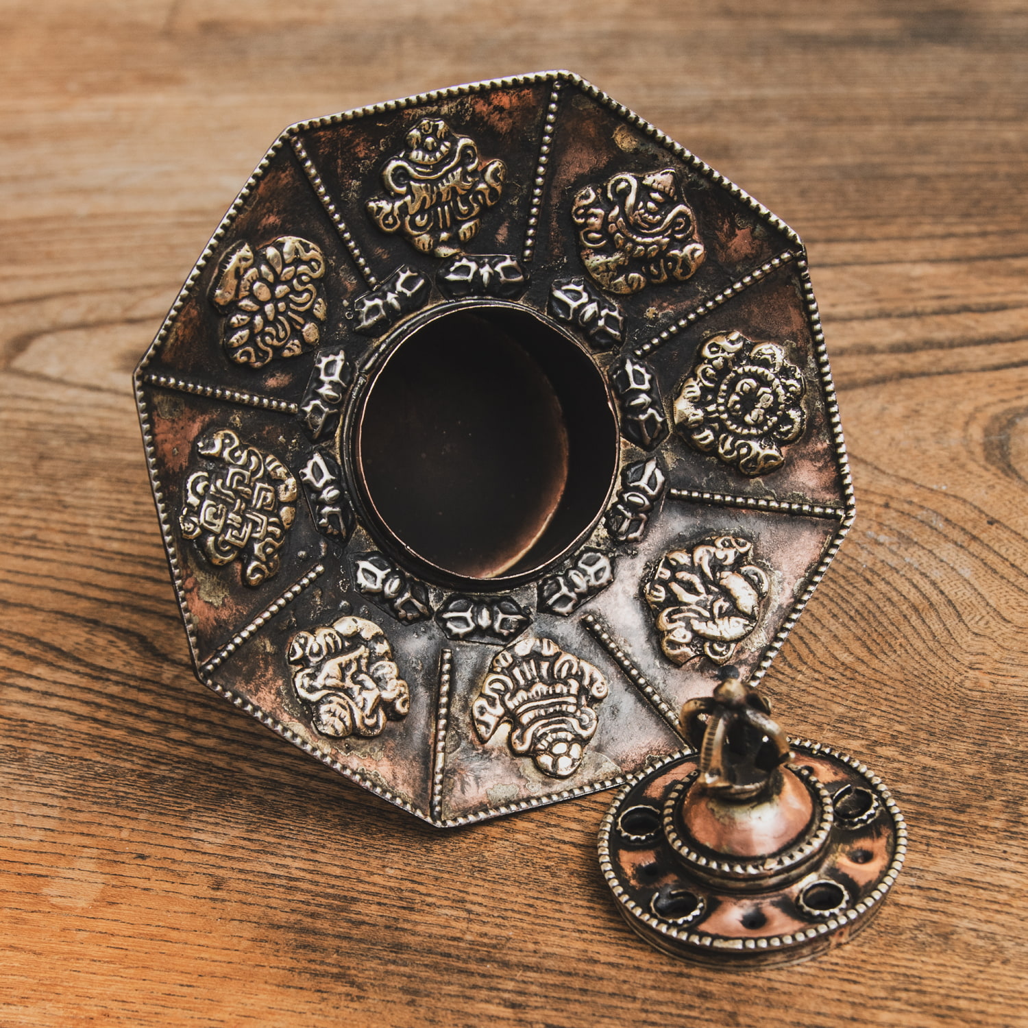 蓮の形のデザインが素晴らしく、葉の部分にはエンドレスノットなどの八つの吉兆が配置されています。