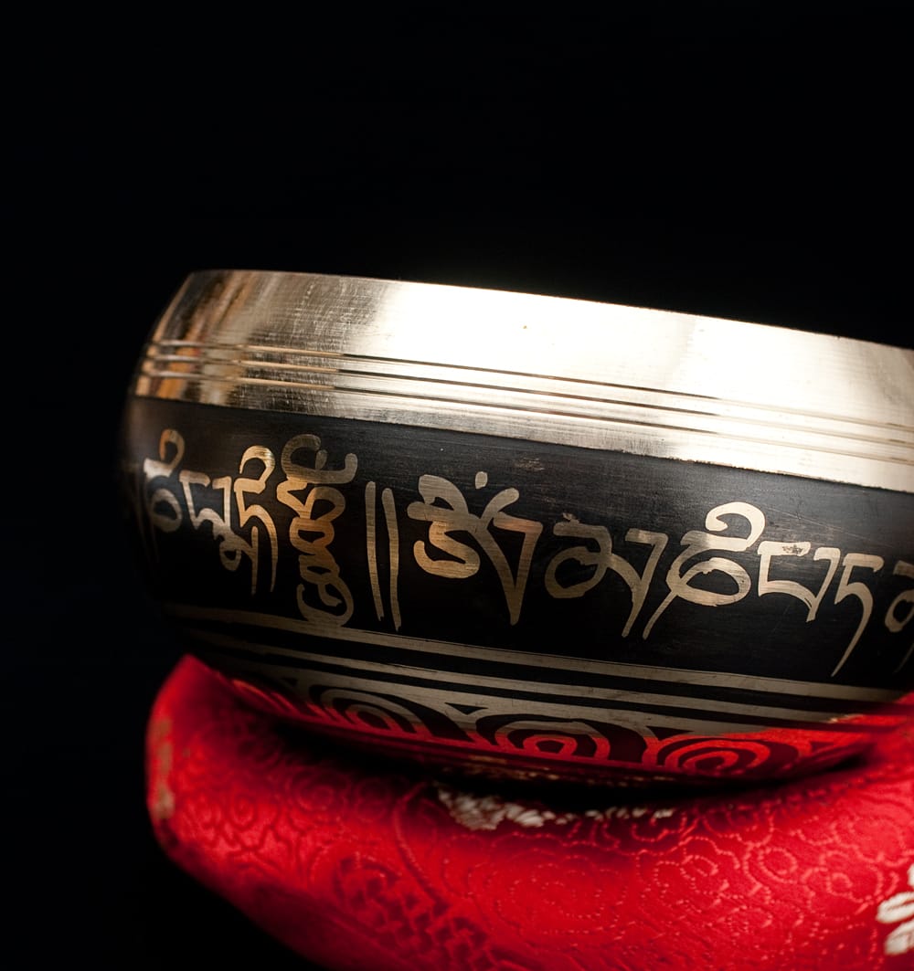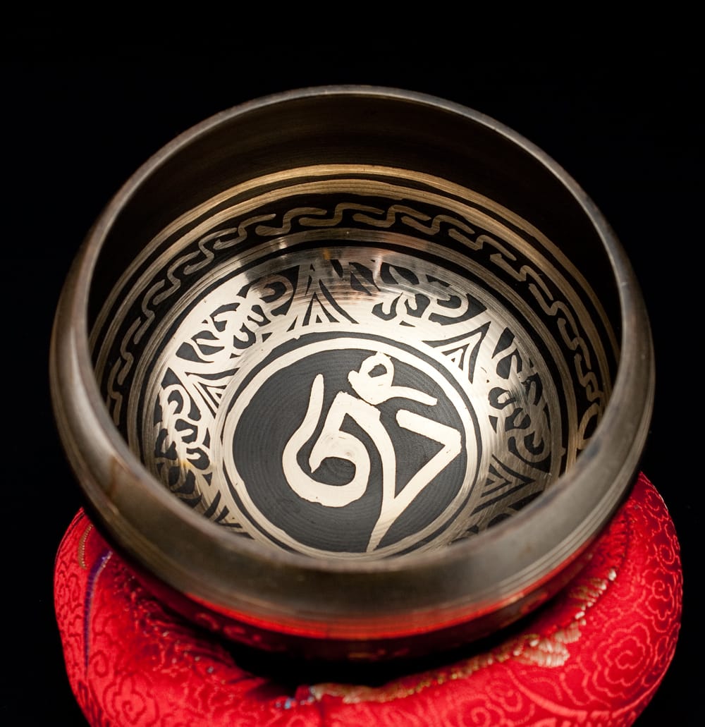 こちらのシンギングボウルは、シンプルシンギングボウルに模様を施した物になります。フチの部分はフラットに加工されているので、回して鳴らすのもやり易く作られています。職人によって施された装飾は、触れた時の手触りも良いです。マントラや、ヴィシュヴァ・ヴァジュラ、アグニ、シャンカなどのチベット吉祥文様に加え、ブッダやオーン、オンマニペメフム、ロータスなどが美しく彫られています。