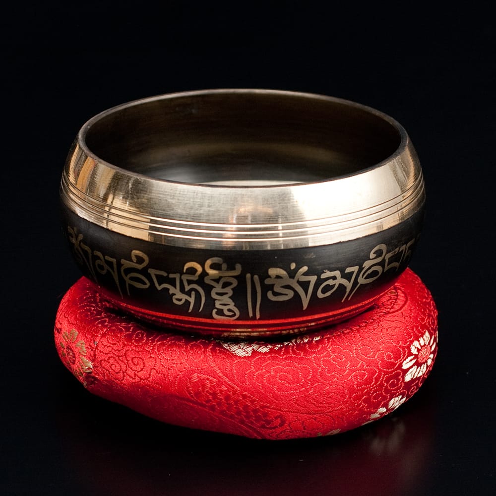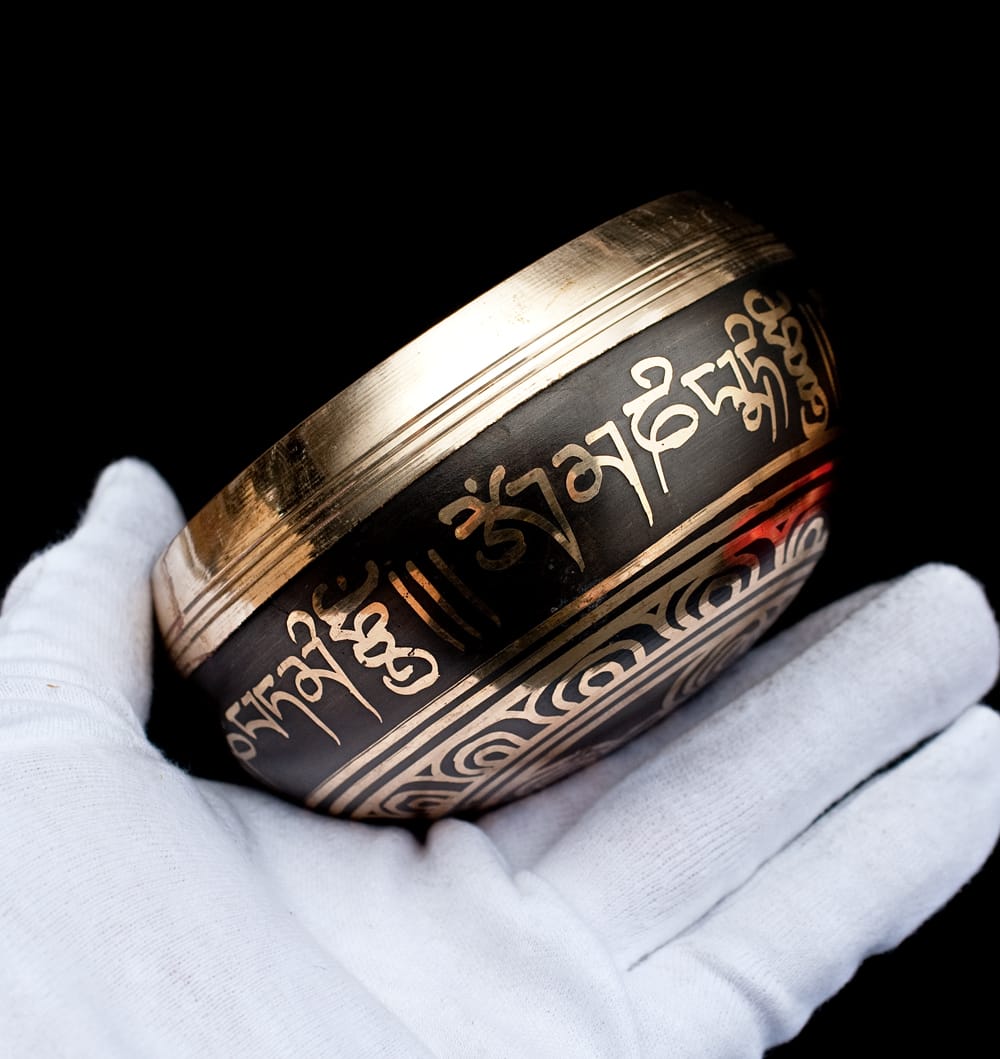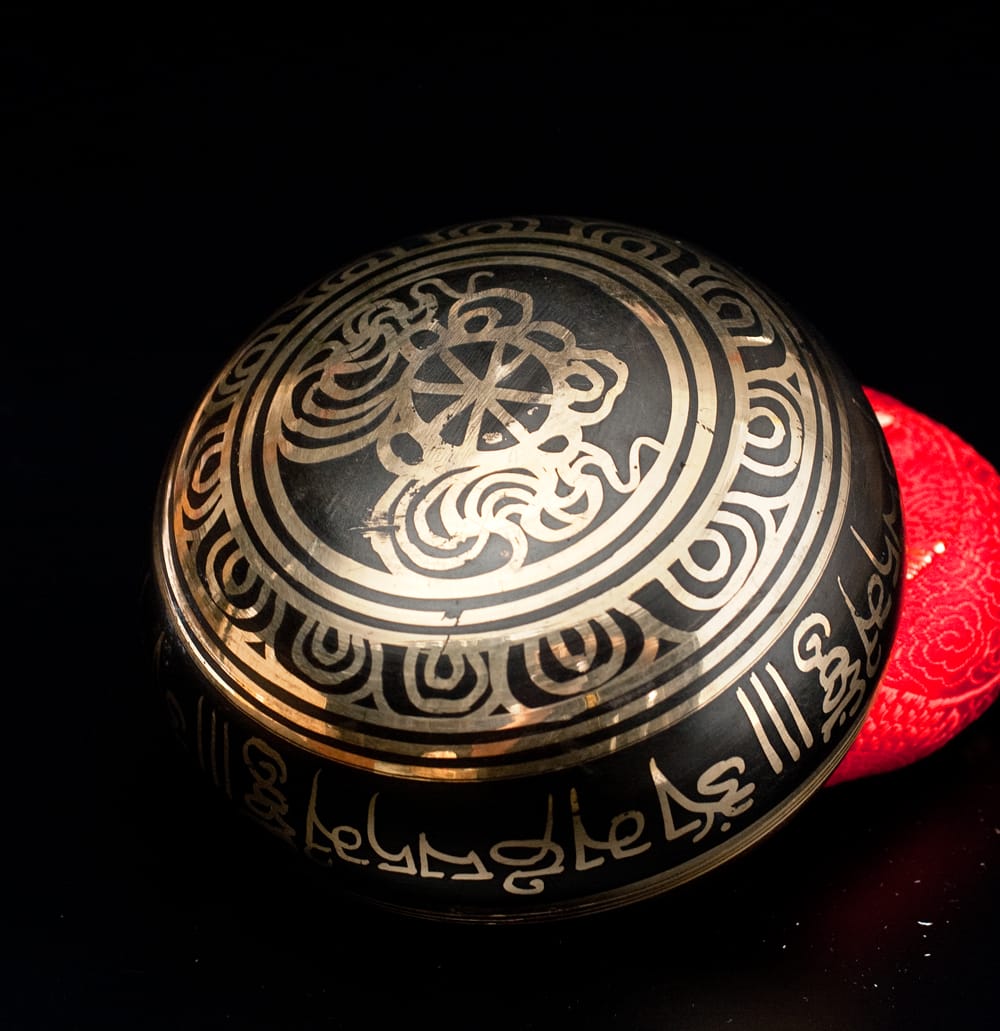 チベット吉祥柄などの文様を施したブラックシンギングボウルです。鳴らしやすさと見た目の良さが魅力の一点もの。写真一番下の再生ボタンから、実音の試聴が可能です。(写真の台座は付属いたしません)