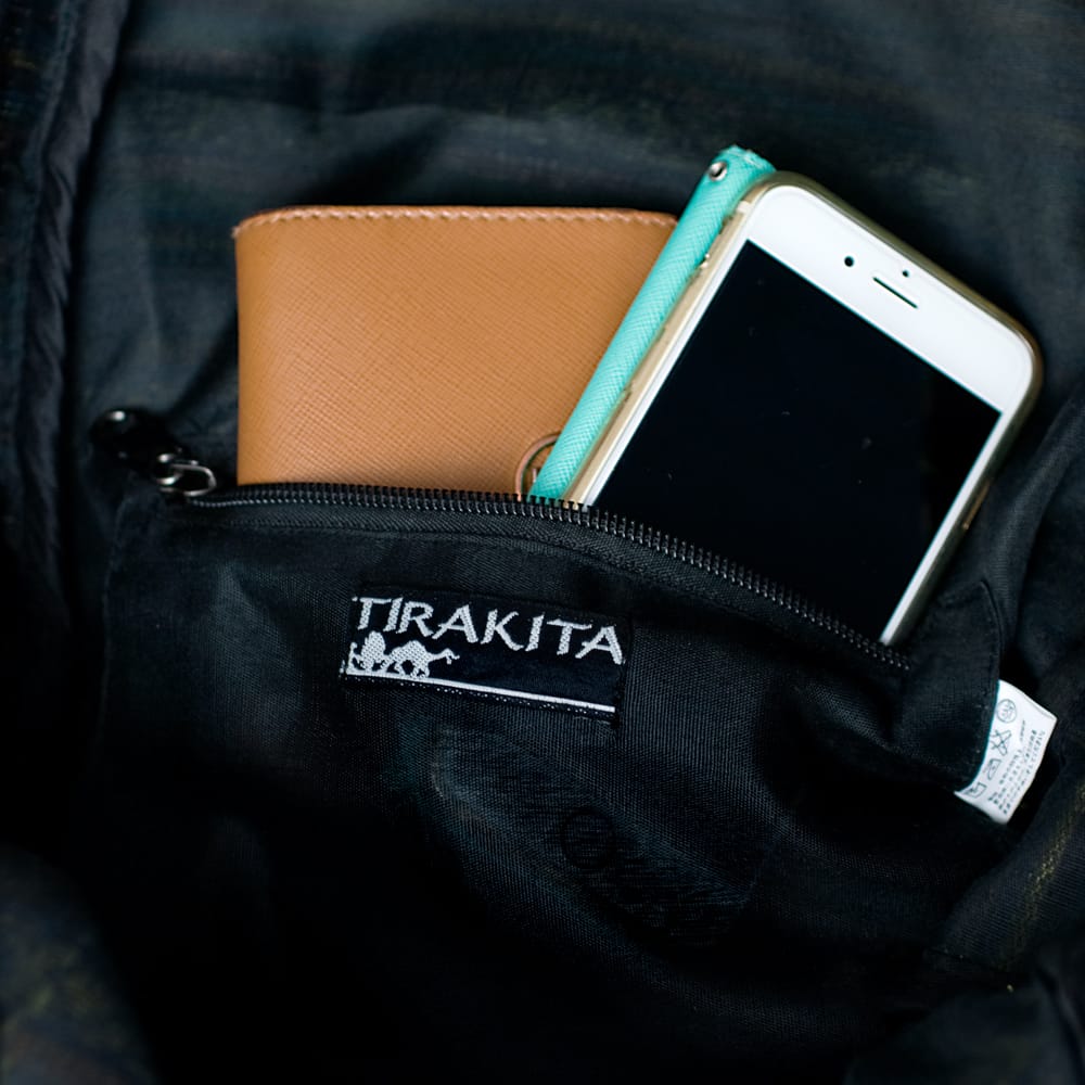 本体内ポケットはめだたないのですが、ちょうどパスポートや保険証などのサイズが収まるようになっていて、貴重品入れにしています。