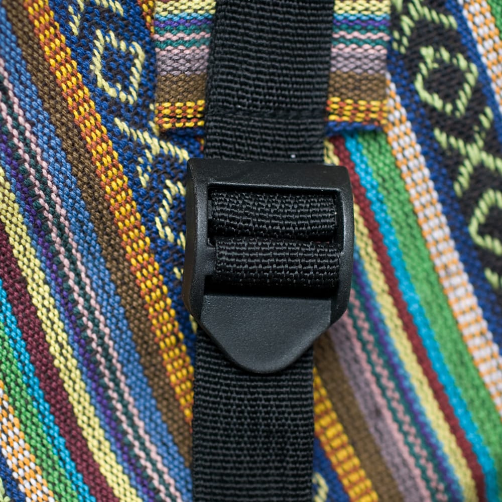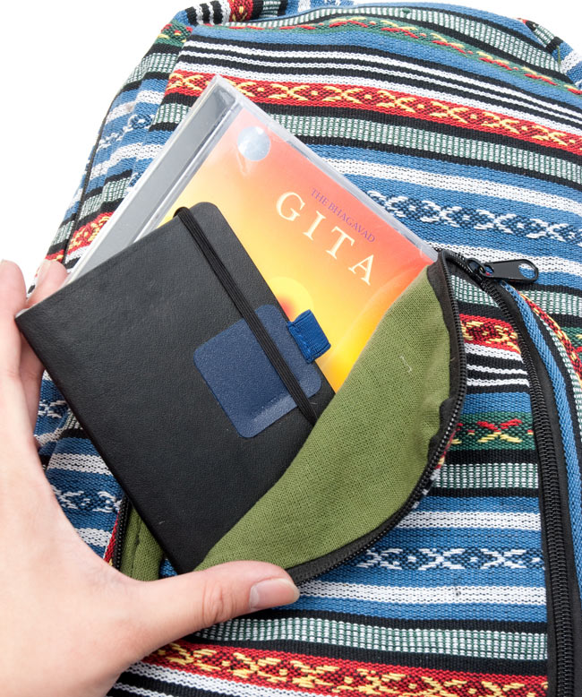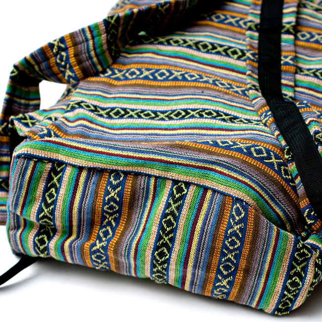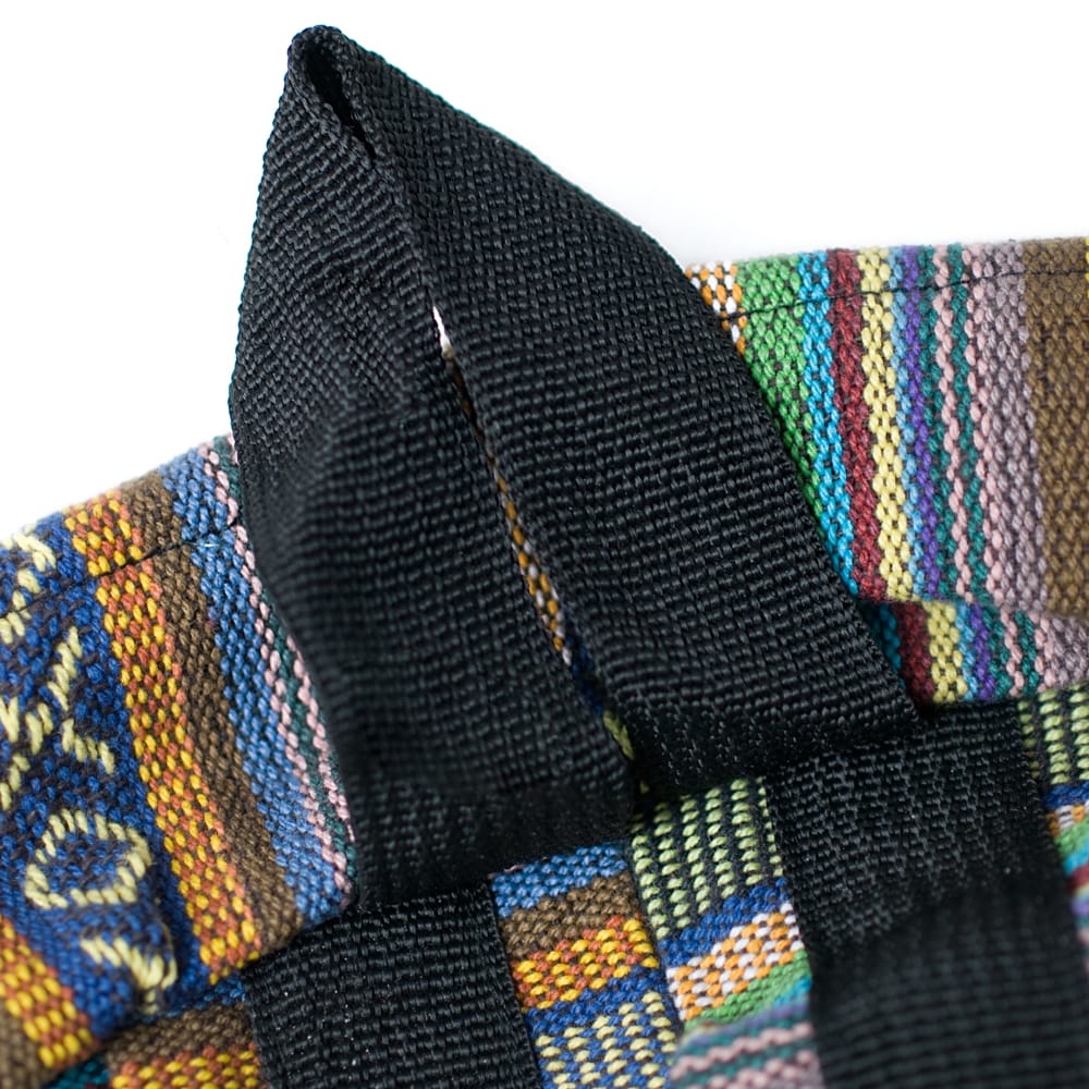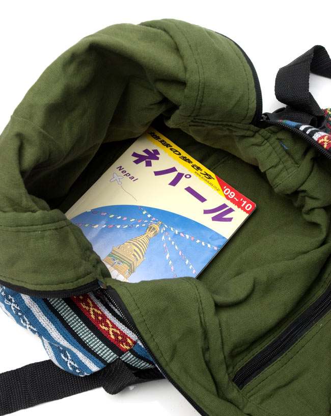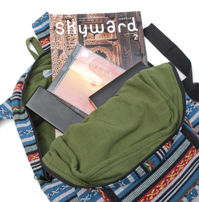 このバッグの布地はゲリと呼ばれる、ネパール独自の生地が使われています。カラフルなこの生地は、ネパールの人たちが自分たちが好きな色合いで作っているもので、太めの糸で織られた温かみのある風合いです。ちょっと粗めの生地ですのでワイルドな雰囲気にもピッタリです。■見かけ以上に収納できます
