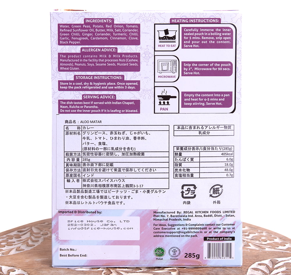 【Regal Kitchen】アルー マター - ALOO MATAR 2人前 285g x 15個