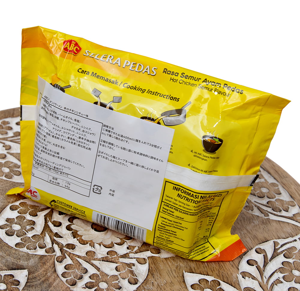 こちらの商品はお得な34個セットです。送料無料で、かつ単品でご購入いただくよりも合計で240円、お得なお値段になっています。インドネシア発、【ABC】のインスタントラーメン 辛ロチキンシチュー味です。