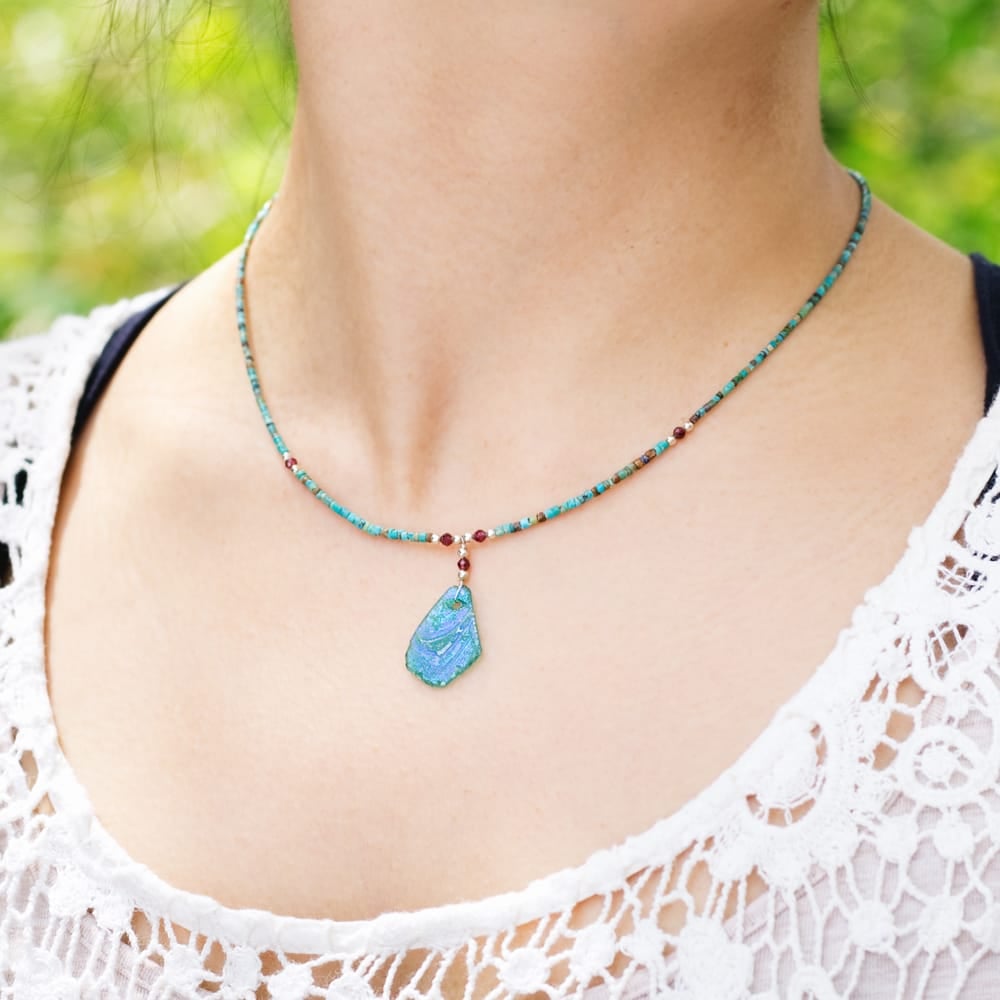 ペンダントトップのローマンガラスだけでも綺麗ですが、ペンダントチェーンの部分がローマンガラスの色合いと相性が良い、ターコイズを基調に装飾されているのが特徴です。また、緑のターコイズだけではなく、部分的にビーズや、他の天然石を混ぜてあるので、単調にならずとても綺麗な仕上がり。ストーンは首にあたっても痛くないように、しっかりと角が取られ丸くしてあります。中は細くて上部なワイヤーが入っており、ストーンを束ねてあります。細かいところまで、丁寧にハンドメイドされたネックレスです。