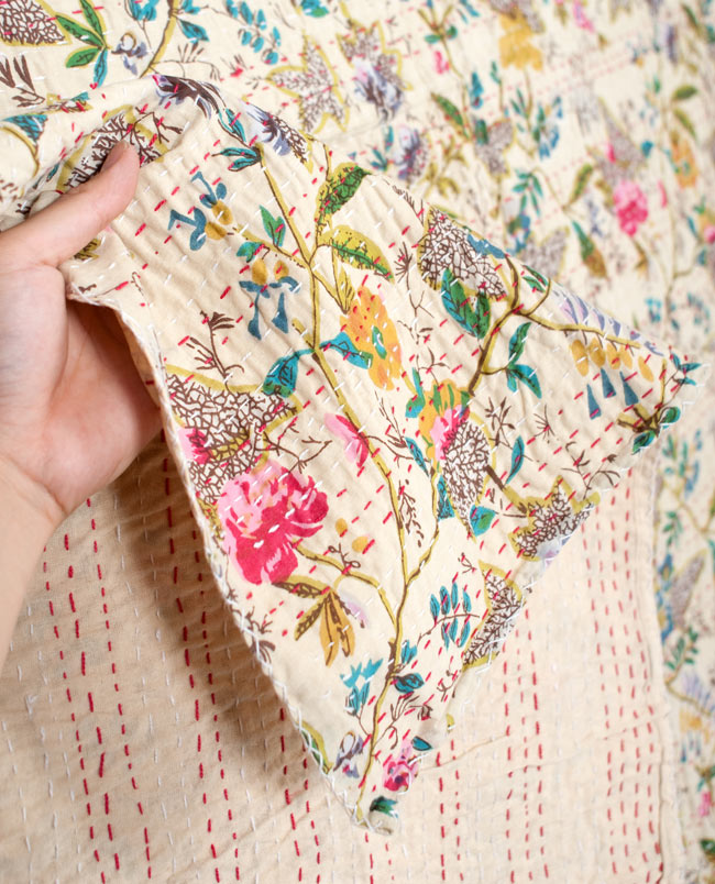〔約150cm×224cm〕ラリーキルト 手作りカンタ刺繍のソファー&ベッドカバー - ベージュ