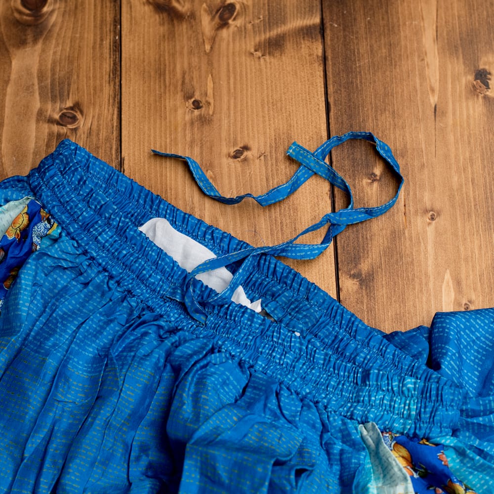 使われているサリー生地は層のようにトータル4種類。それぞれをつなぎ合わせたパッチワークになっています。さらに、アンティークサリーなので、それぞれが同じ組み合わせのない一点もの。自分だけの特別な1枚になりますよ。また、お送りするスカートは、ハンガーに掛けて片方を広げてある写真一枚目の物となります。