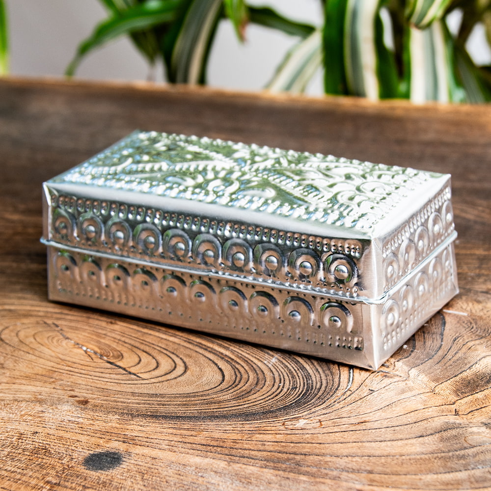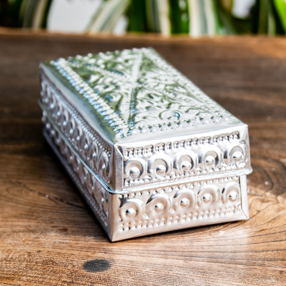 アジアンな雰囲気漂う、打ち出し細工のデザインが魅力です。バリ島でひとつひとつ手作業で作られた、ミニサイズのアルミケースです。伝統的な打ち出し模様が表面にあしらわれ、太陽のような神聖なモチーフが印象的。アクセサリーやお守り、ピアスやリングなど、ちょっとした小物の収納にぴったりです。旅先の思い出を入れておいたり、お香やチャクラストーンの保管にもオススメ。 インテリア雑貨として、棚の上や玄関まわりのアクセントにもなります。