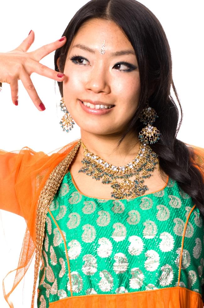 またの名を「サルワール・カミーズ」とも呼ばれる、南アジアの民族衣装です。シャツを意味する「カミーズ」、ズボンを意味する「サルワール」、「ドゥパッタ」と呼ばれるショールの3点セットで着用します。3点セットなので、お色味もコーディネートされていてとても統一感があります。インドでは、サリーに比べると若年層が愛用しているというイメージでしょうか。デザインもパンツなので動きやすくスタイリッシュなデザインとなっています。■スパンコールやビーズ、刺繍で華やか