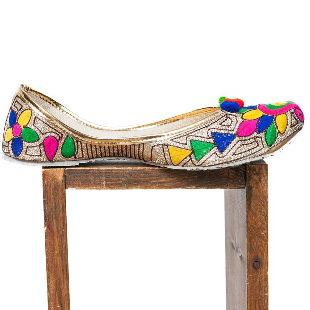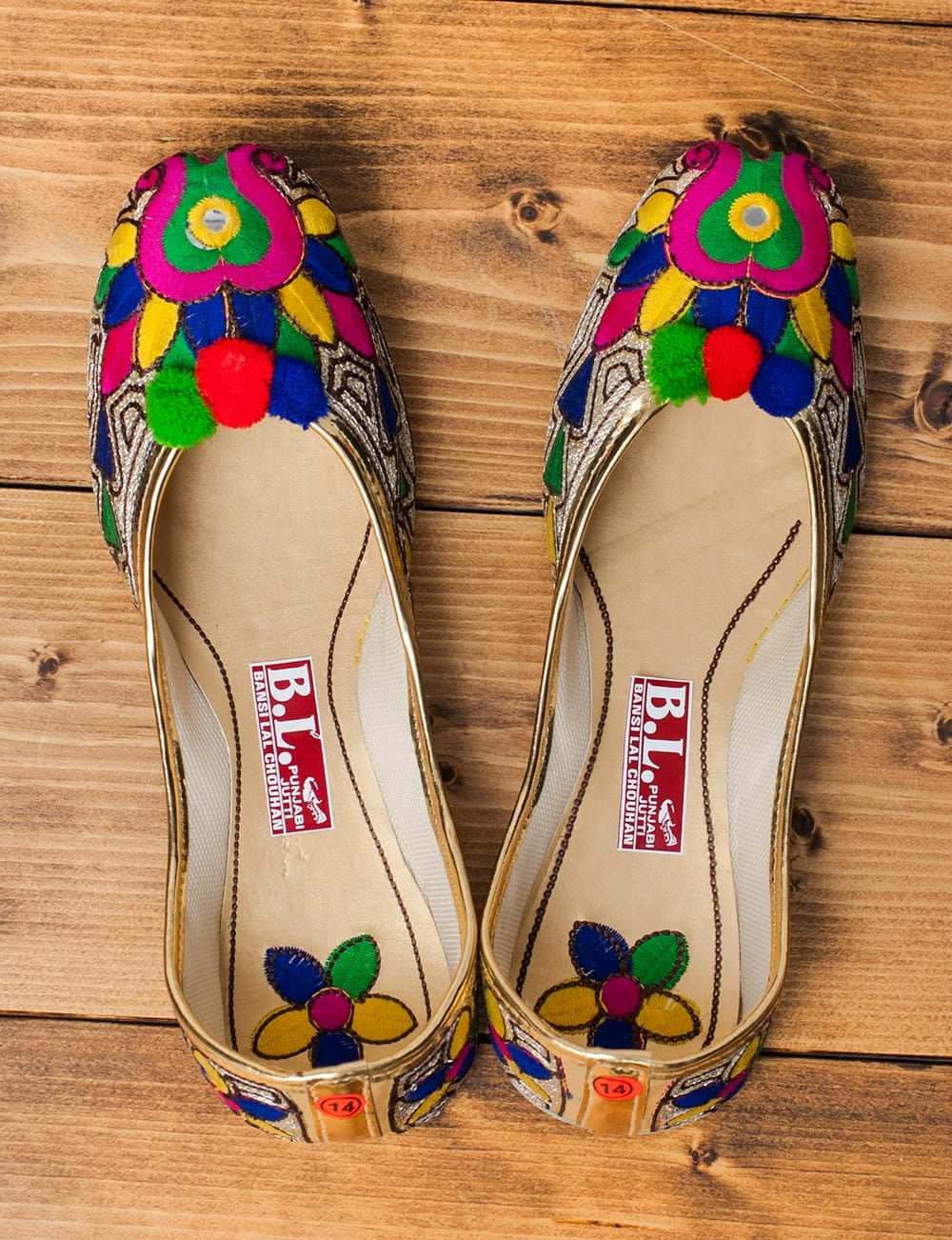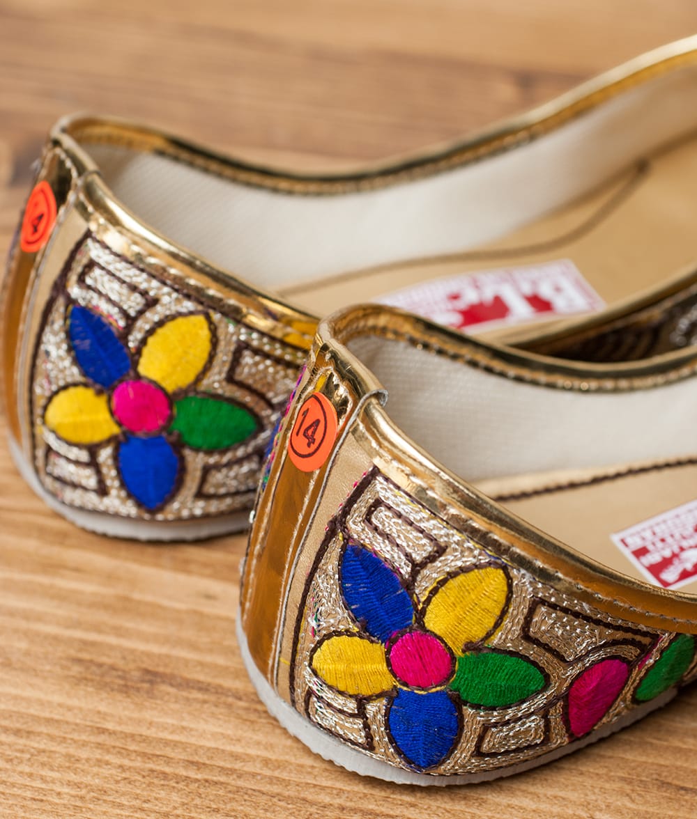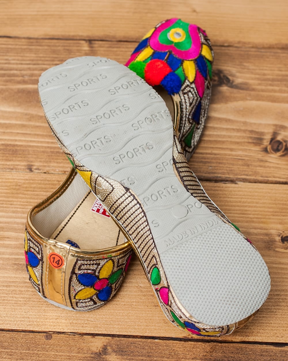 色とりどりのサリーが舞う国インドから華やかなフラットシューズがやって来ました。ビーズやスパンコールがキラキラと輝き、ところ狭しと刺繍が施されています。このシューズでパンジャビドレスやサリーを合わせたら、コーディネートは完璧だね!というインドスタイルです。どれも微妙にデザインが異なりますが、どれが良いか迷ってしまうくらいバランスの取れた配色にうっとりします。インドの女性って本当に華やかなデザインが好きなんだな?と改めて実感する一品です。エスニックファッションだけでなく、シンプルにデニムやTシャツに合わせてもかっこよく決まりますよ!