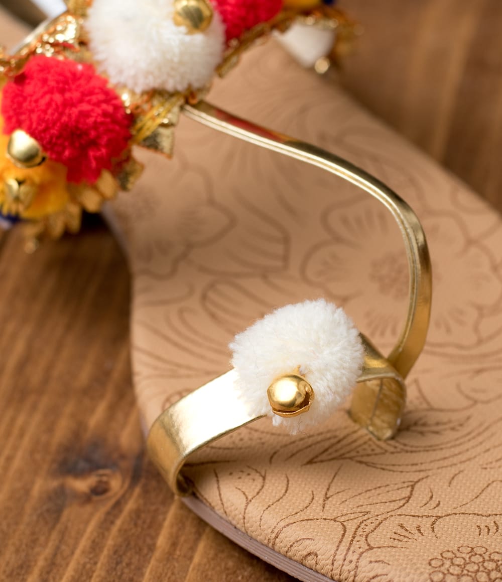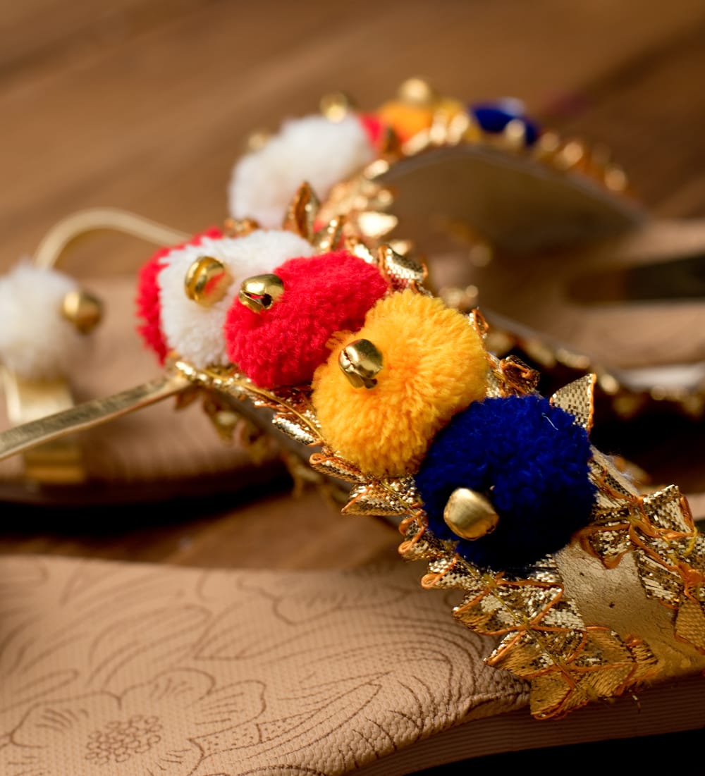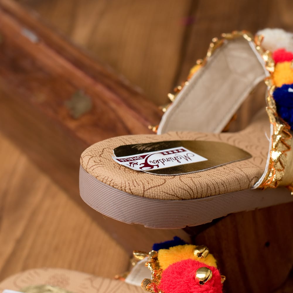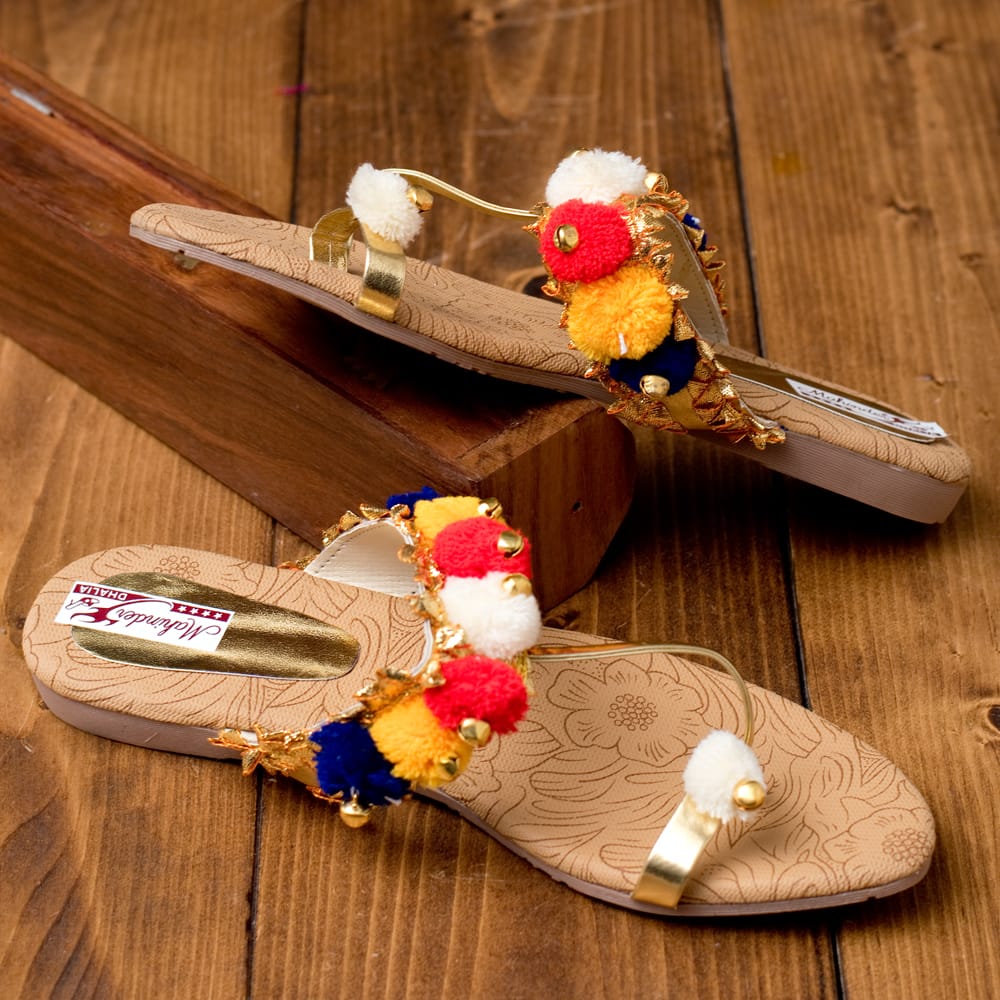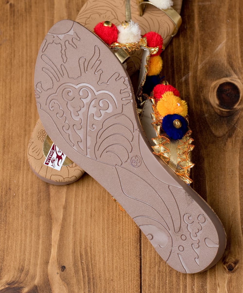 グジャラート州のカッチ(Kutch)地方で作られている刺繍織物をカッチ刺繍といいます。古くはマハラジャへの献上品としても喜ばれたというだけあって、濃密な刺繍は美術品のような美しさ。色鮮やかな刺繍やミラーワーク、ポンポンなどが特徴です。こちらはそんなカッチ刺繍をデザインに取り入れたサンダル。サンダルのベースカラーは落ち着いているので、カッチテイストのカラフルさを美しく引き立てています。お出かけするのが楽しくなるサンダルです。