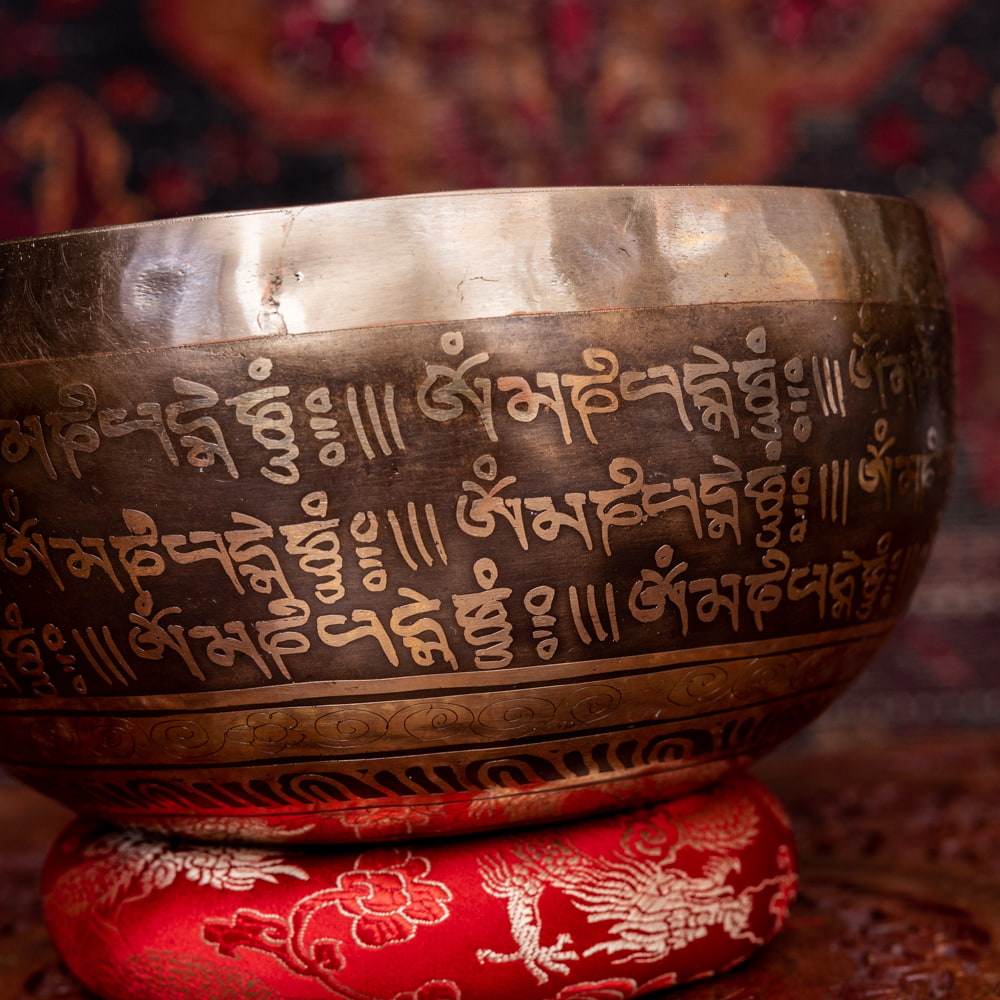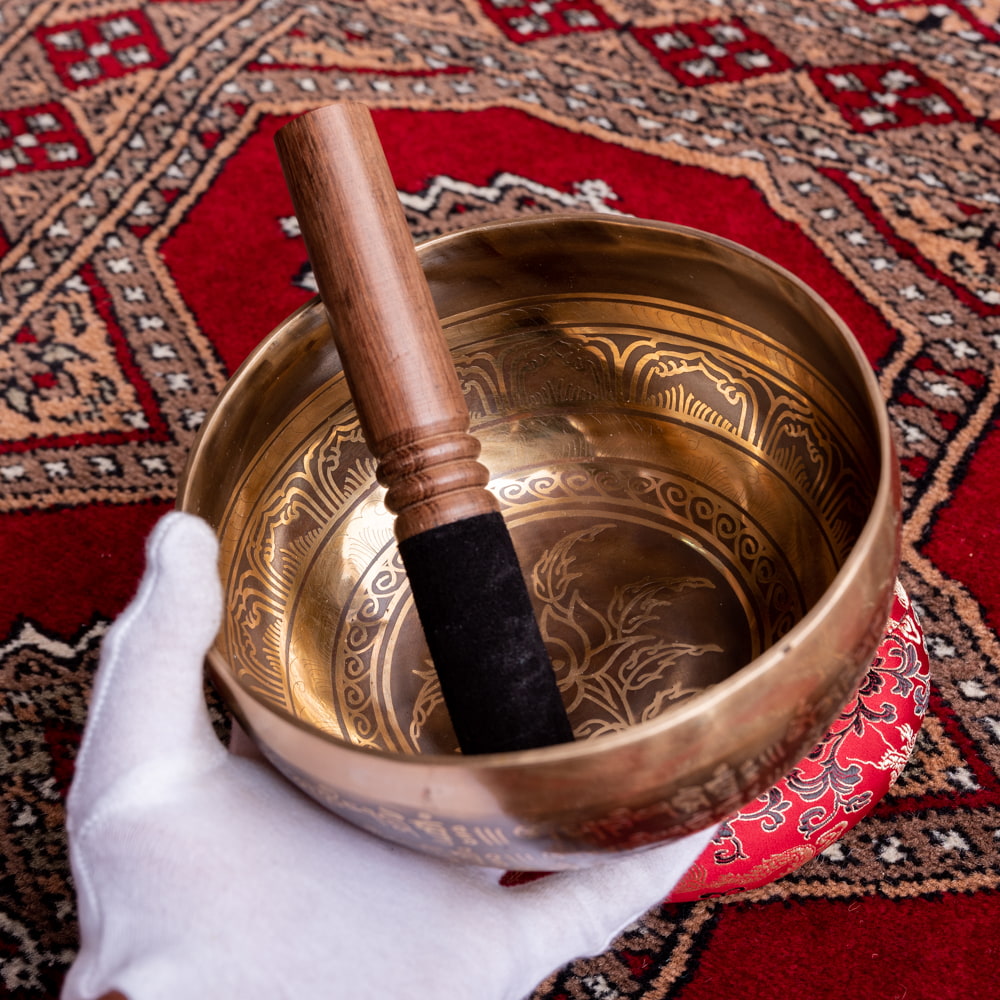 深みのある音色に加え特徴的なのが、職人によって手彫りされた美しい文様です。マントラや、ヴィシュヴァ・ヴァジュラ、アグニ、シャンカなどの吉兆柄に加え、ブッダなどが美しく彫られています。全ての柄をご覧いただけるよう、底面を含め写真に収めておりますので、是非御覧くださいませ。音色だけではなく、視覚的にも楽しく癒してくれる一品です。■シンギングボウルの鳴らし方について■
