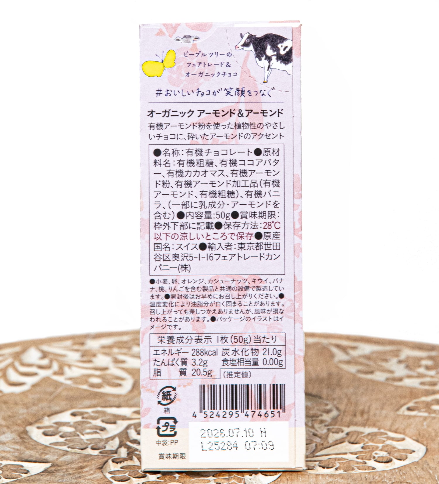 | 原材料・成分 | 有機粗糖, 有機ココアバター, 有機カカオマス, 有機アーモンド粉, 有機アーモンド加工品(有機アーモンド、有機粗糖), 有機バニラ, (一部に乳成分を含む) |