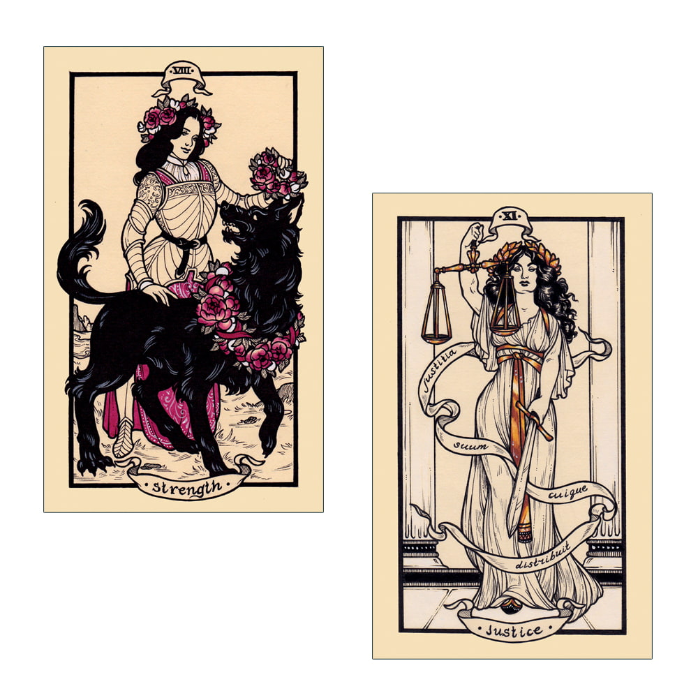 ★8番が力、11番が正義のカード、0番フールはカード向かって左向きに書かれていますのでウエイト版に準拠かと、、8番力の女子の頭に無限大ないですが、、書くスペースなかったのか書き忘れかと思います。どこかに書いてあるのか?もしよろしければ、こっそり教えてくださいましたら幸いです