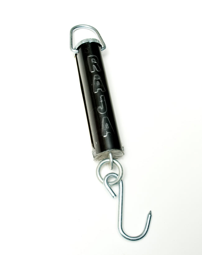 使い方は簡単。下部のフックに量りたいものを吊し、重さを量るだけです。100gきざみで50kgまで量れます。