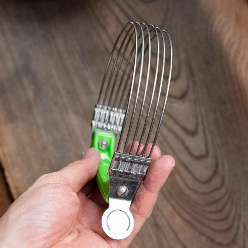 こちらはタイからやって来た、パイ生地やスコーン、ビスケットなど、お菓子作りに使われる調理器具です。バターなどの脂肪分と、小麦粉を混ぜるために使われます。手作業よりも速く、効率的、均一に生地を混ぜることができ、パイやビスケットがサクサクとした食感に仕上がります。特に、パイ生地では冷たいバターを使い、生地自体の温度を上げない工夫が必要なので、そういった点でも手の温度が伝わらないので適しています。
