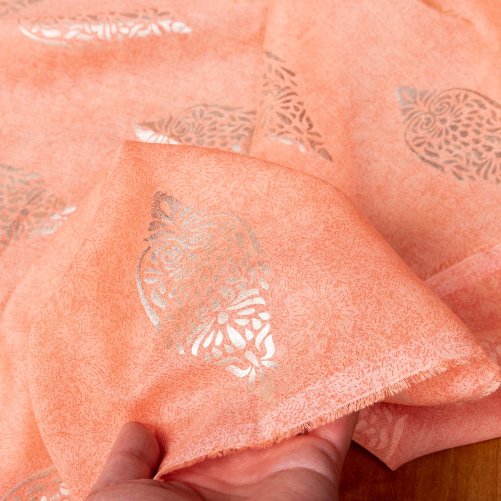 | ご注意 | こちらは1m単位の切り売りとなります。1点ご購入で1m、3点ご購入で3mなどご注文個数に応じた長さでお送りいたします。生地により、つながった状態でお送りできる長さは、最大で10m程度ですので、長さによっては分割される場合がございます。なお、こちらは切り売りになりますのでお客様都合でのご返品はできかねます。インドの現地購入商品ですので、ホツレやプリントの若干の剥がれ、色ムラ等がある場合があります。また、ボールペンなどで部分的に現地の品番や、メートル数の記載などがあることがございます。白系の洋服などと擦れると、色移りする場合がございます予めご了承の上お買い求めくださいませ。 |