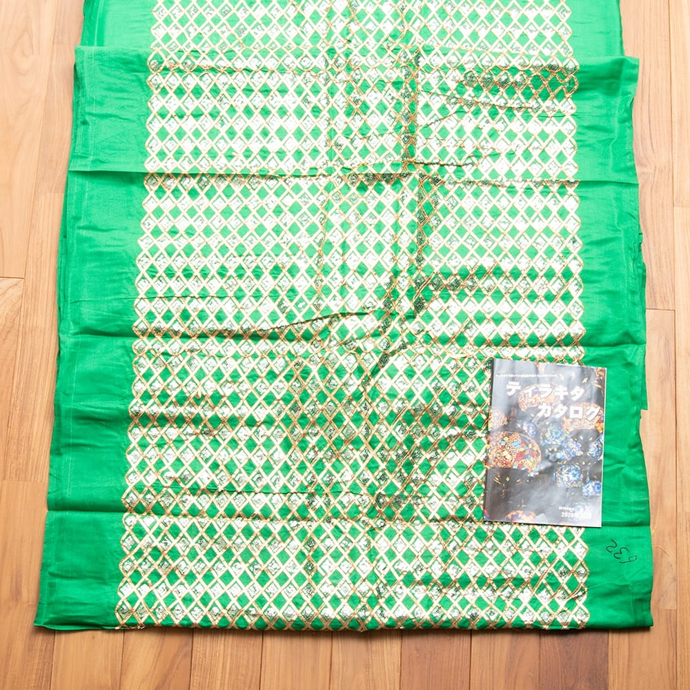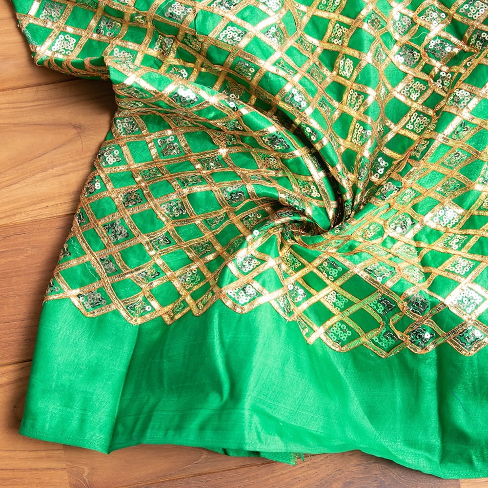 サリーのようなつややかな生地に光り輝くスパンコールを散りばめた美しい布です。インドらしい豪華極まりない色合いと煌きが美しく、飾り布として様々な場所でお使いいただけます。シンプルに壁などを飾るにも素敵ですし、手持ちの衣類やカバンなどをグレードアップしたり、ベリーダンスの衣装などステージアイテムを作るのも素敵です。■便利な計り売り!