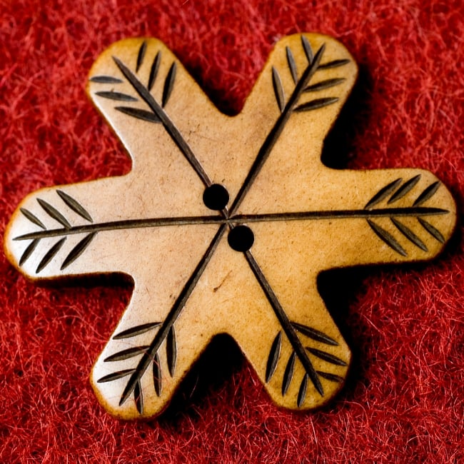 ネパールの人たちが水牛の角を使い、模様を手で彫った手作りのボタンです。ひとつひとつ手作りのため、よく見ると若干模様が異なったり、線の太さが違ったりしますが、それもまた手作りならではの温かさです。■服や鞄につけて