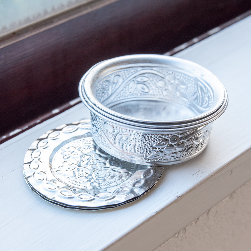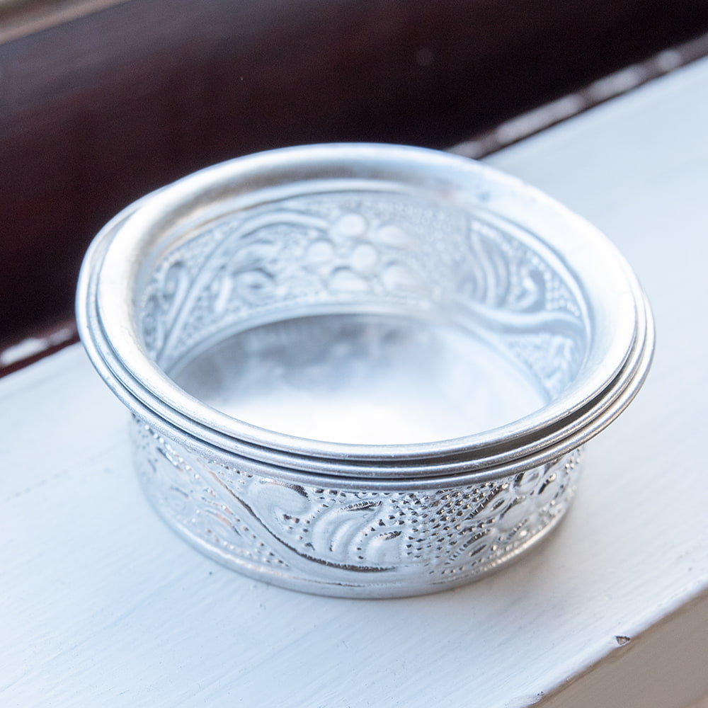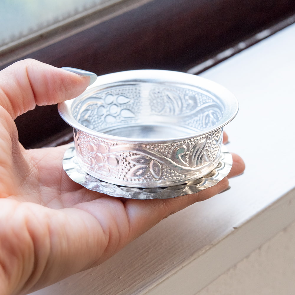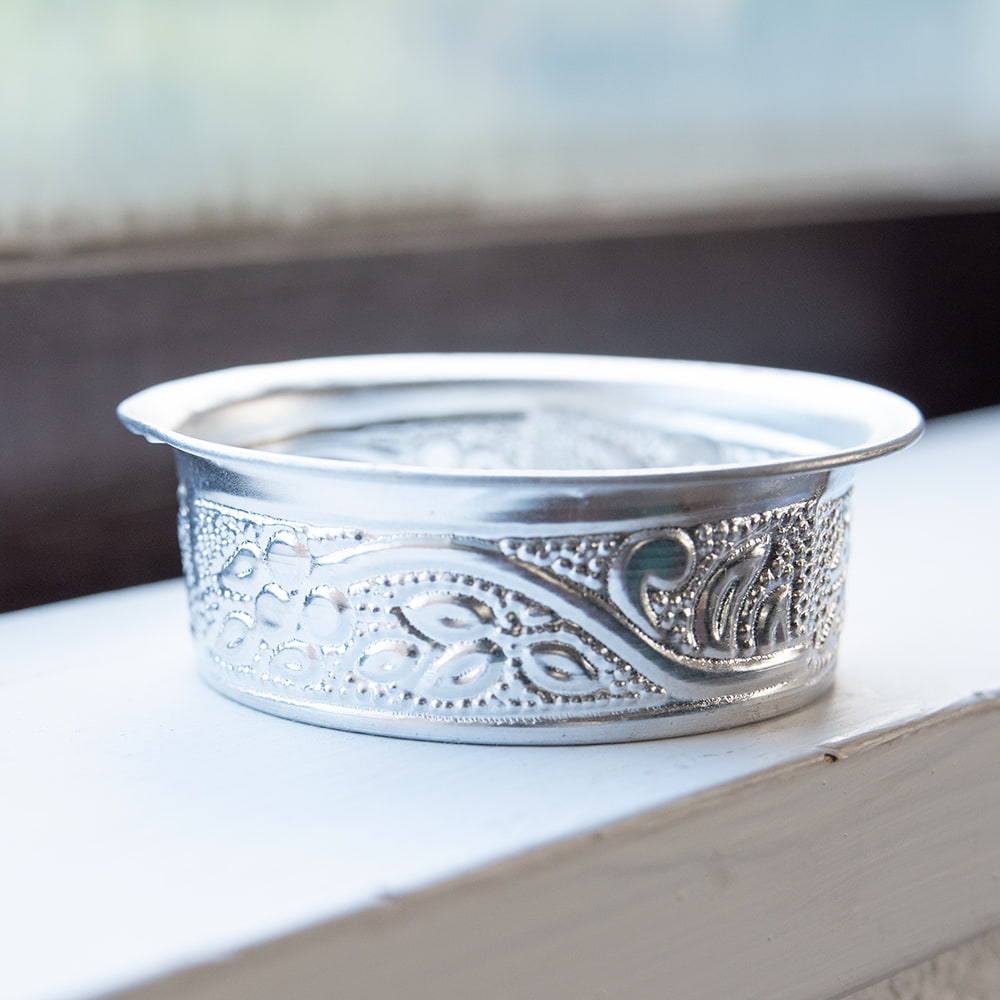 インドならではの美しい唐草模様の装飾がデコボコのエンボスになって入っている美しいソーサー。シンプルながらもインドを感じることができます!アルミ独特の光沢感が美しく、手で触れるとエンボスの凹凸を感じることができて、その凹凸には滑り止めの効果もあります。