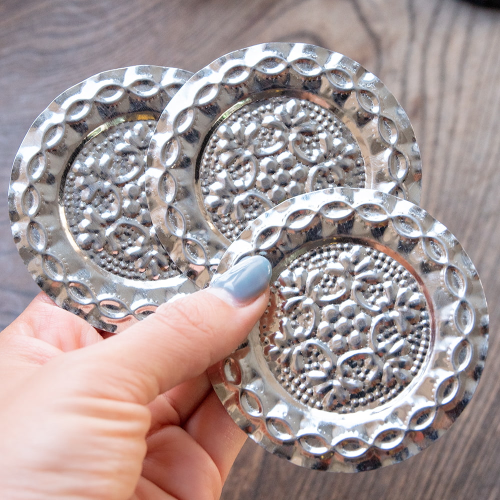 【送料無料・6セット】【3個セット】インド伝統唐草エンボスのアルミソーサーとコースターセット【直径:6.5cm-8cm】