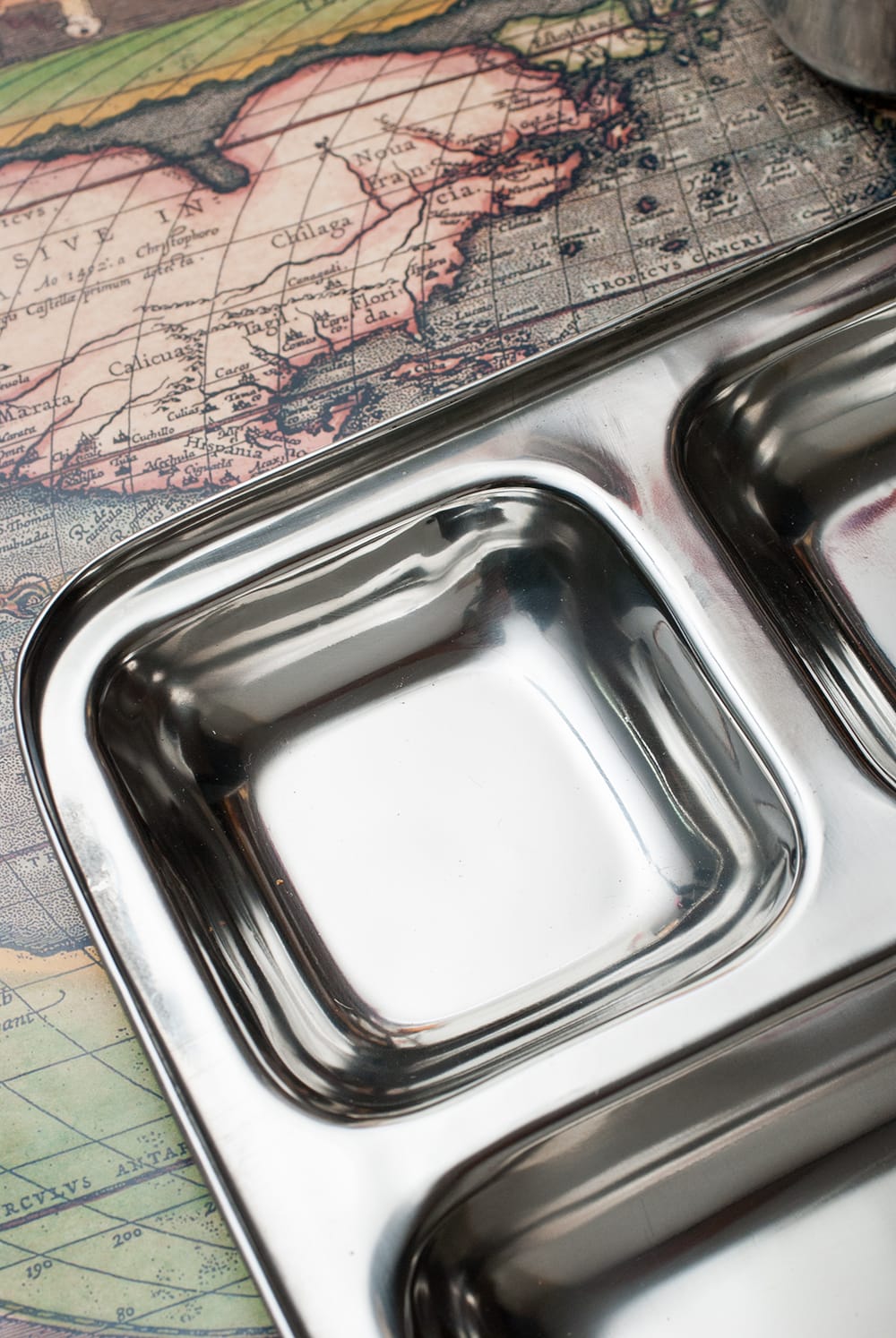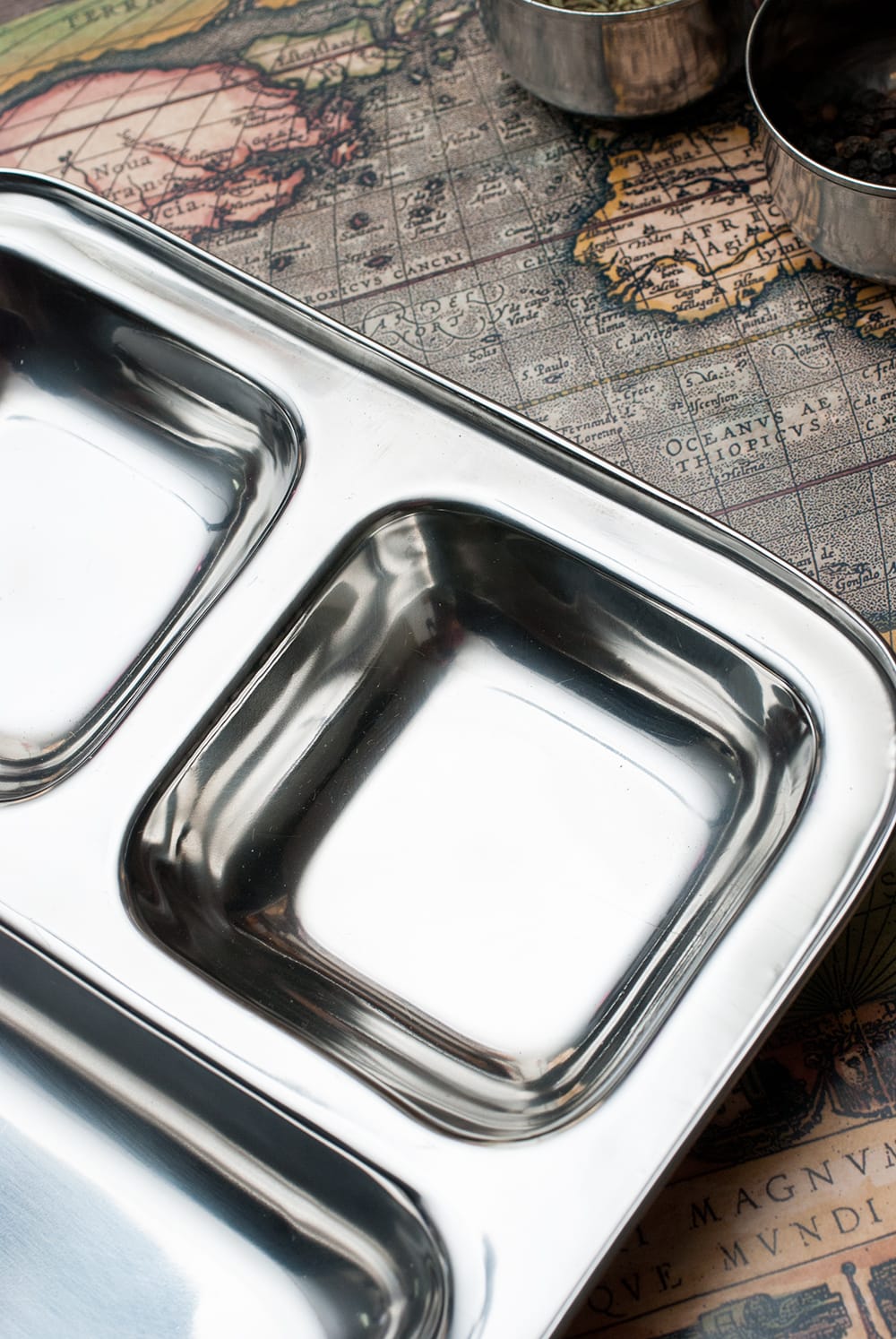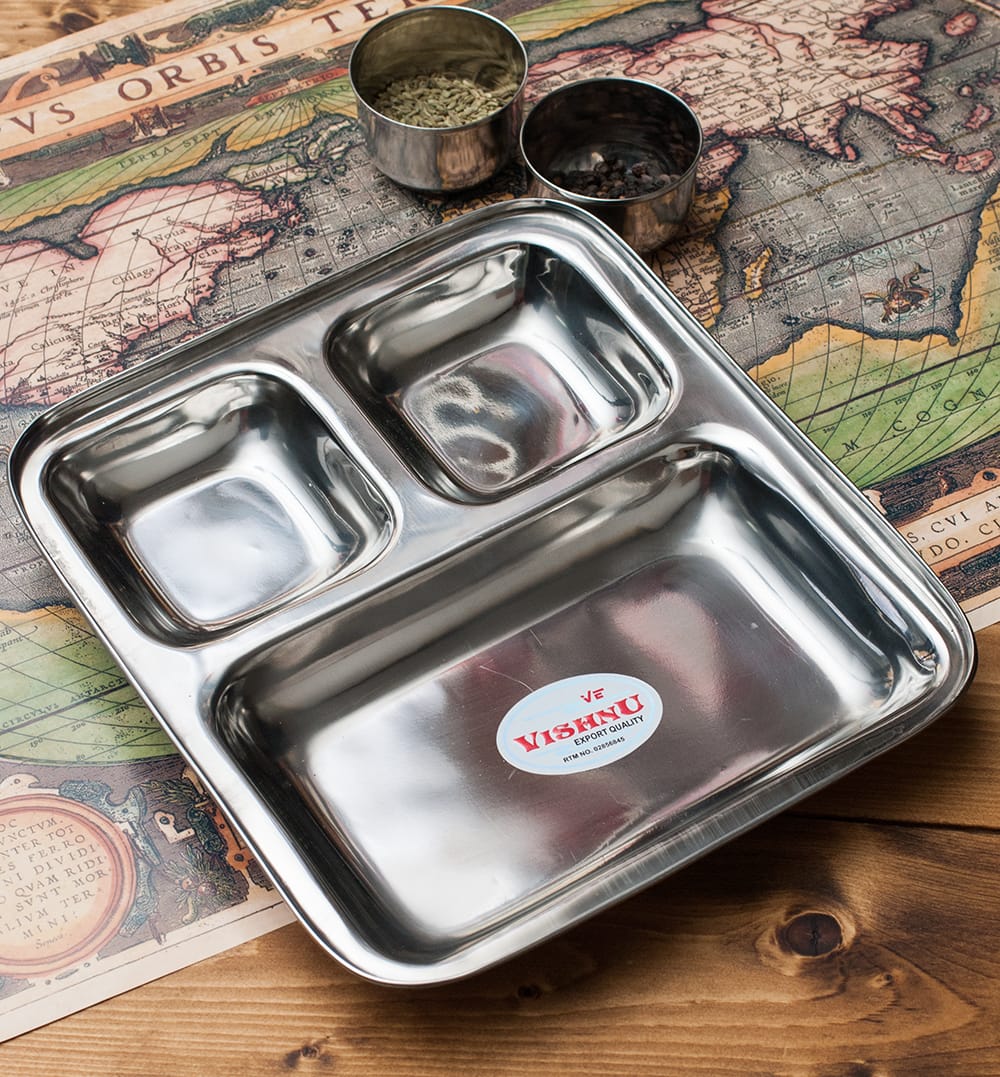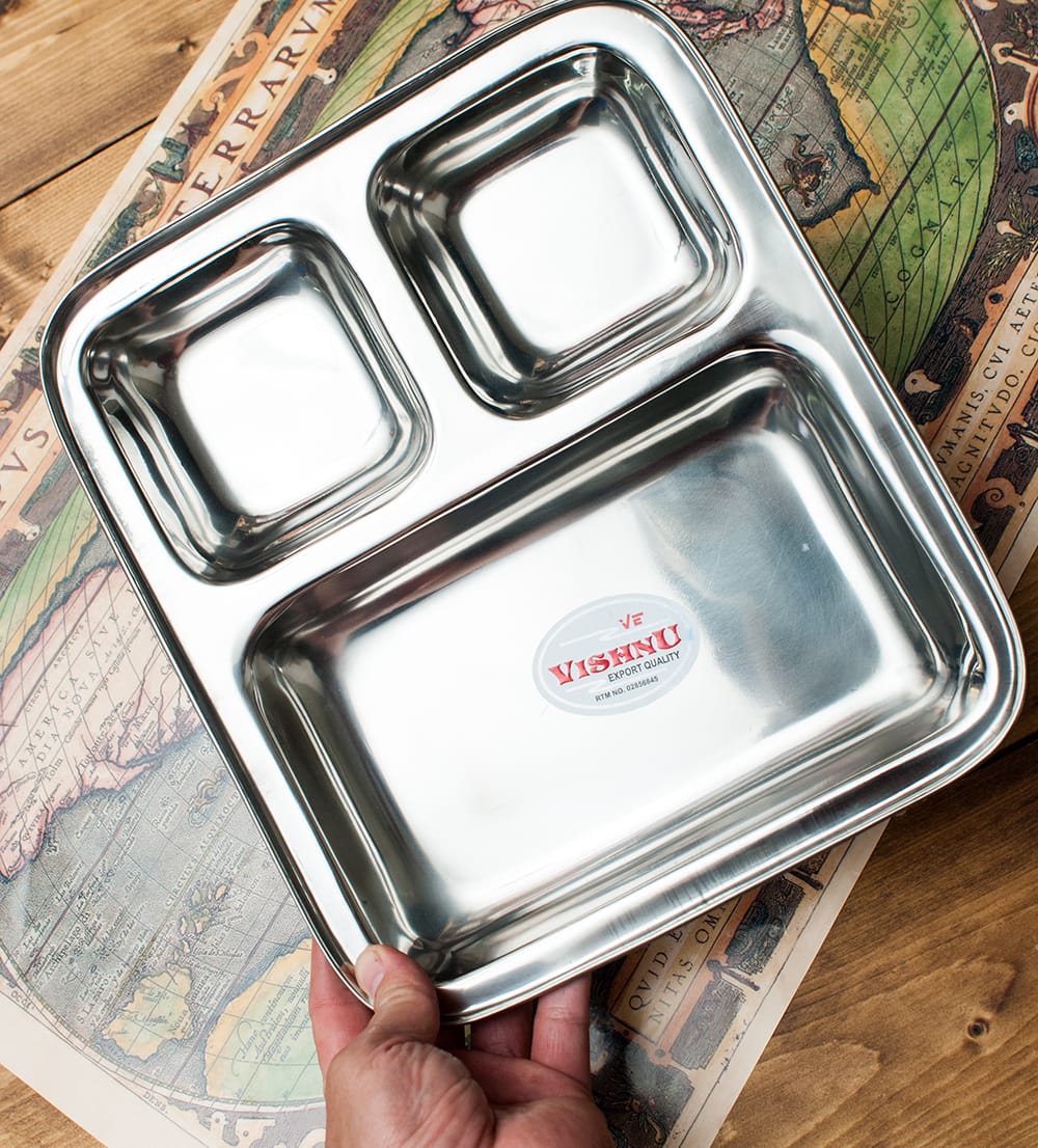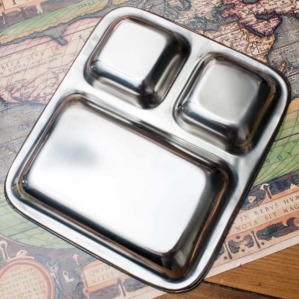 インドの食堂で使われているステンレス製のランチプレートです。3cmほど深さがあるのでインド風にカレーを入れたり、ヨーグルトを入れたり、ご飯を入れたりして使います。重ねて収納できますので、食器棚のジャマにもなりません。丈夫で長持ち、重厚感あるステンレス製ですので長くお使いいただけます。