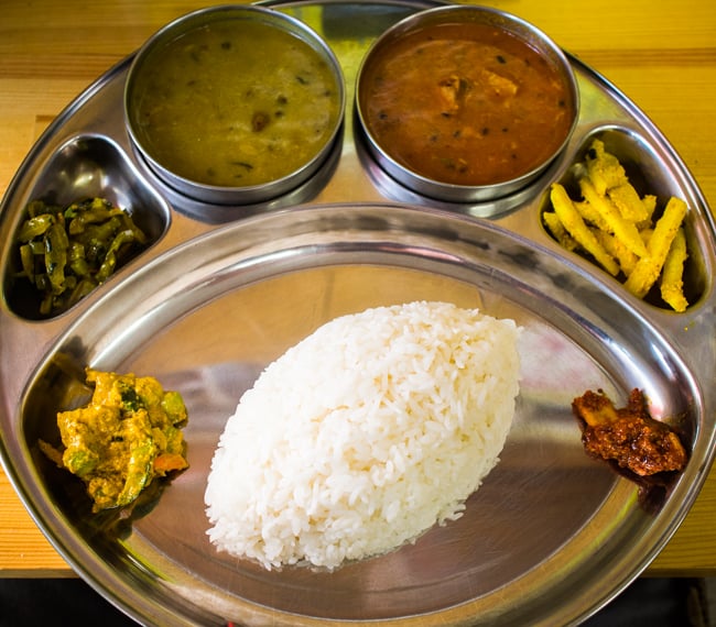 大きな部分にはご飯やチャパティを、小さなくぼみにはカレーやおかずを入れて。