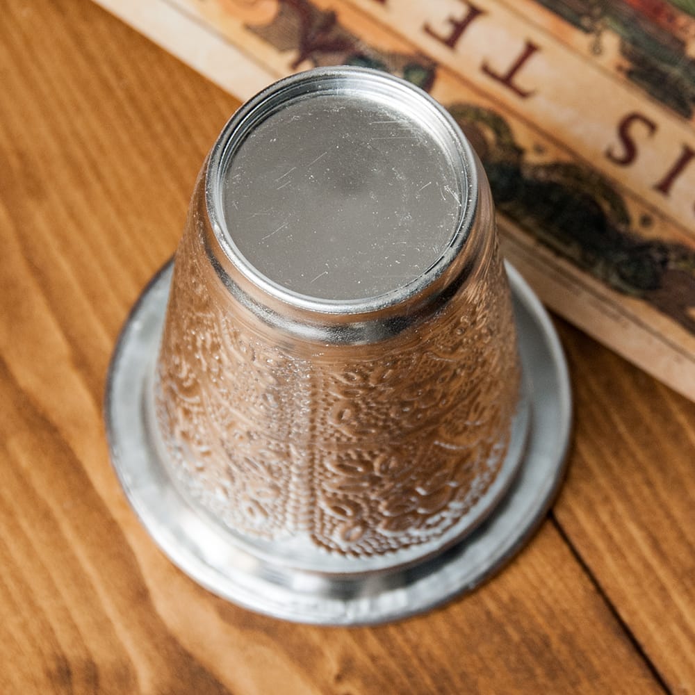 インドならではの美しい唐草模様の装飾がデコボコのエンボスになって入っているコップ。シンプルながらもインドを感じることができます!アルミ独特の光沢感があり、手で触れるとエンボスの凹凸を感じることができて、その凹凸には滑り止めの効果もあります。