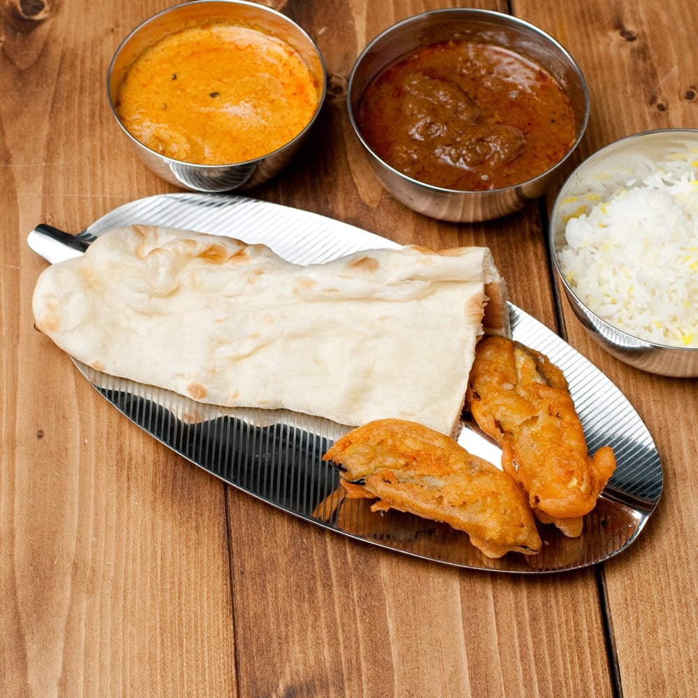 バナナリーフの形をした、ステンレス製の珍しい食器です。南インド料理はもちろん、さまざまな料理へオススメです!