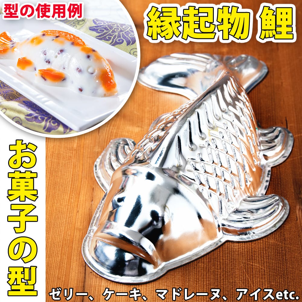 しっかりとしたサイズの、アルミニウムで作られたお菓子の型です。鯉の形をしていて、型から抜いた際に鱗なども、綺麗に出るよう模様が刻まれています。全長は約27cmで、型の一番深いところで約7cmと、かなり大きくしっかりとしたサイズ感があります。■縁起の良い出世鯉
