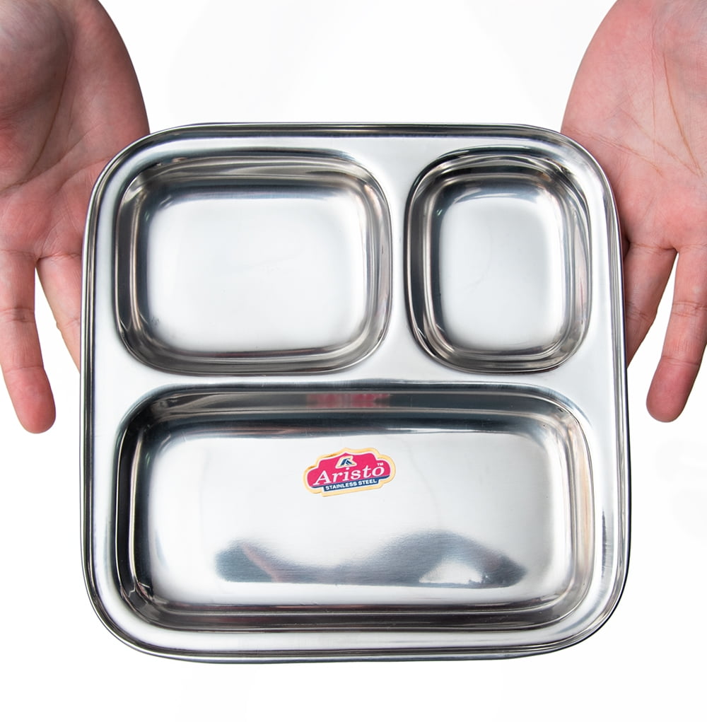 ステンレス製の3分割されたカレー用のプレートです。インドでは食堂などで使われ、小さい所にカレーを入れ、大きな所にはライスを入れて使用しています。ムンバイではパウバジ用のお皿としても使われています。カレーを入れるだけでなく、普通のランチプレートとしても使いやすいです。重ねて収納できますので、食器棚のジャマにもなりません。丈夫で長持ち、重厚感あるステンレス製ですので長くお使いいただけます。