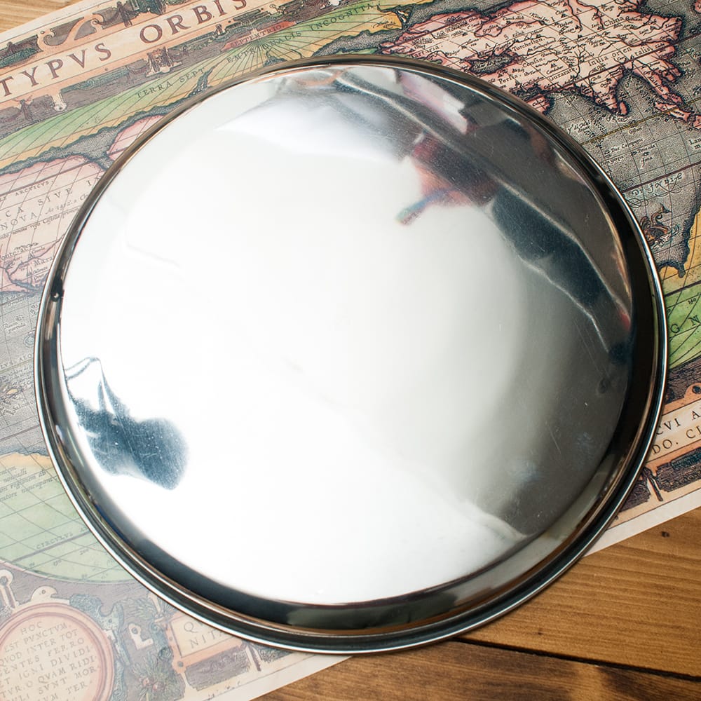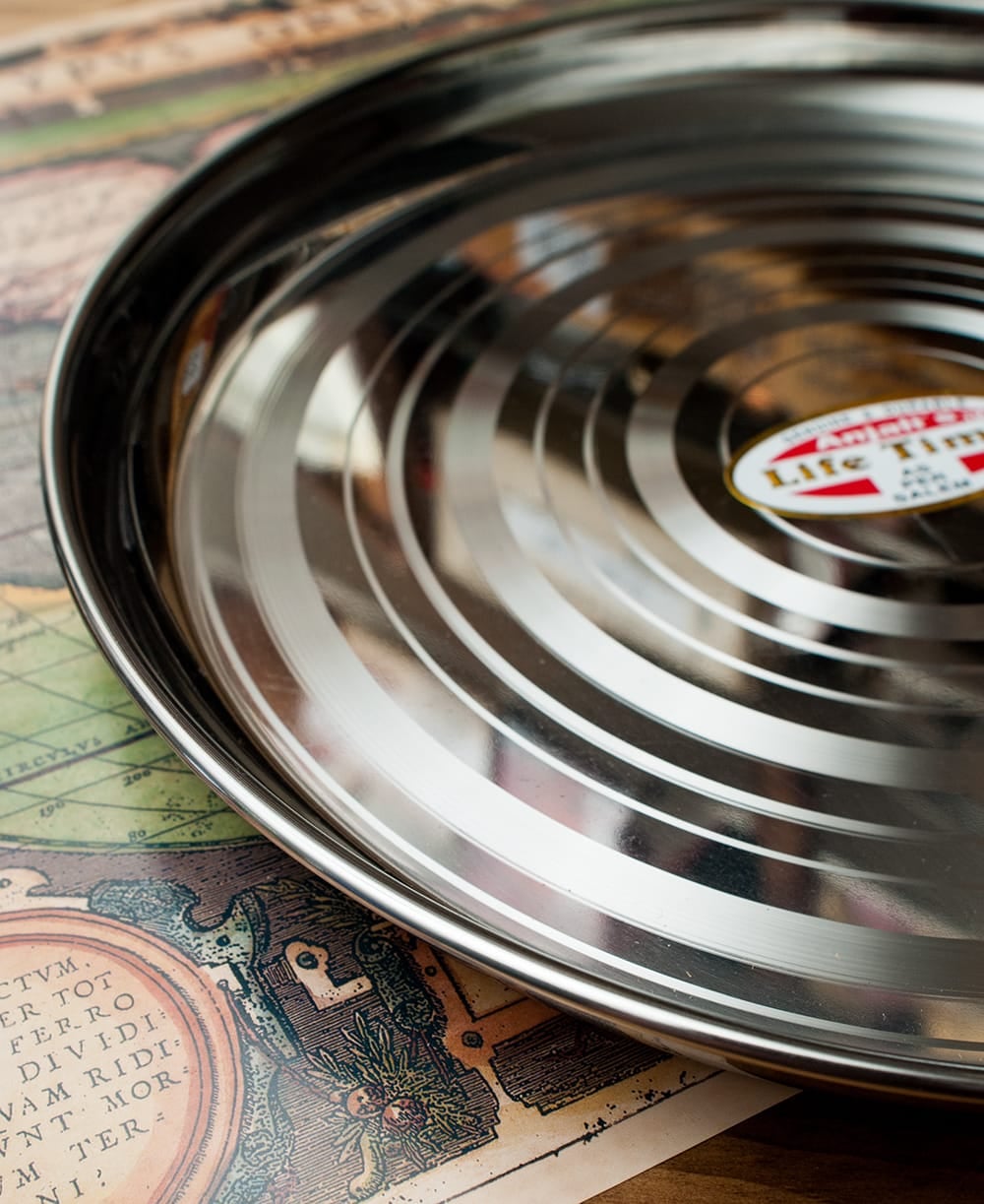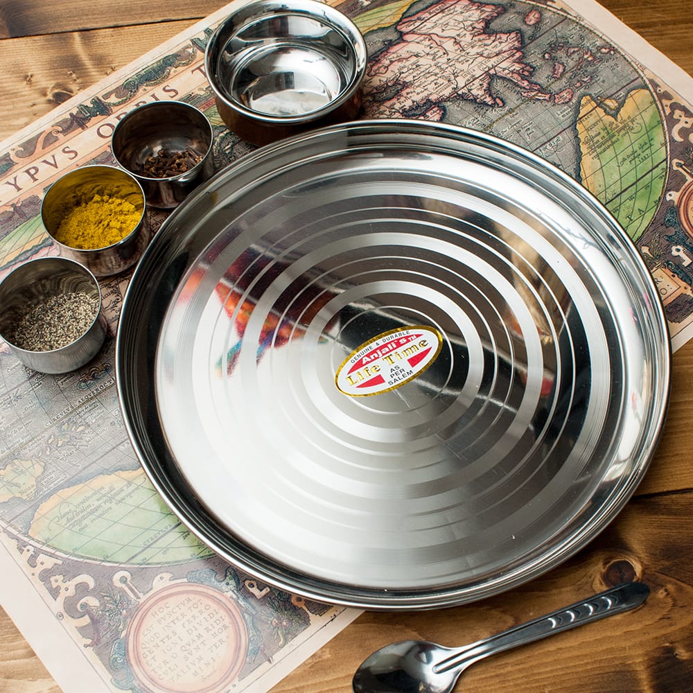 インドでカレーを食べるときに使うステンレス製の大皿。大皿の中にご飯を入れ、小皿の中に数種類のカレーを入れて使用します。うっすらと透かし模様がはいっていてデザイン性も優れた一枚です。■収納しやすい形です