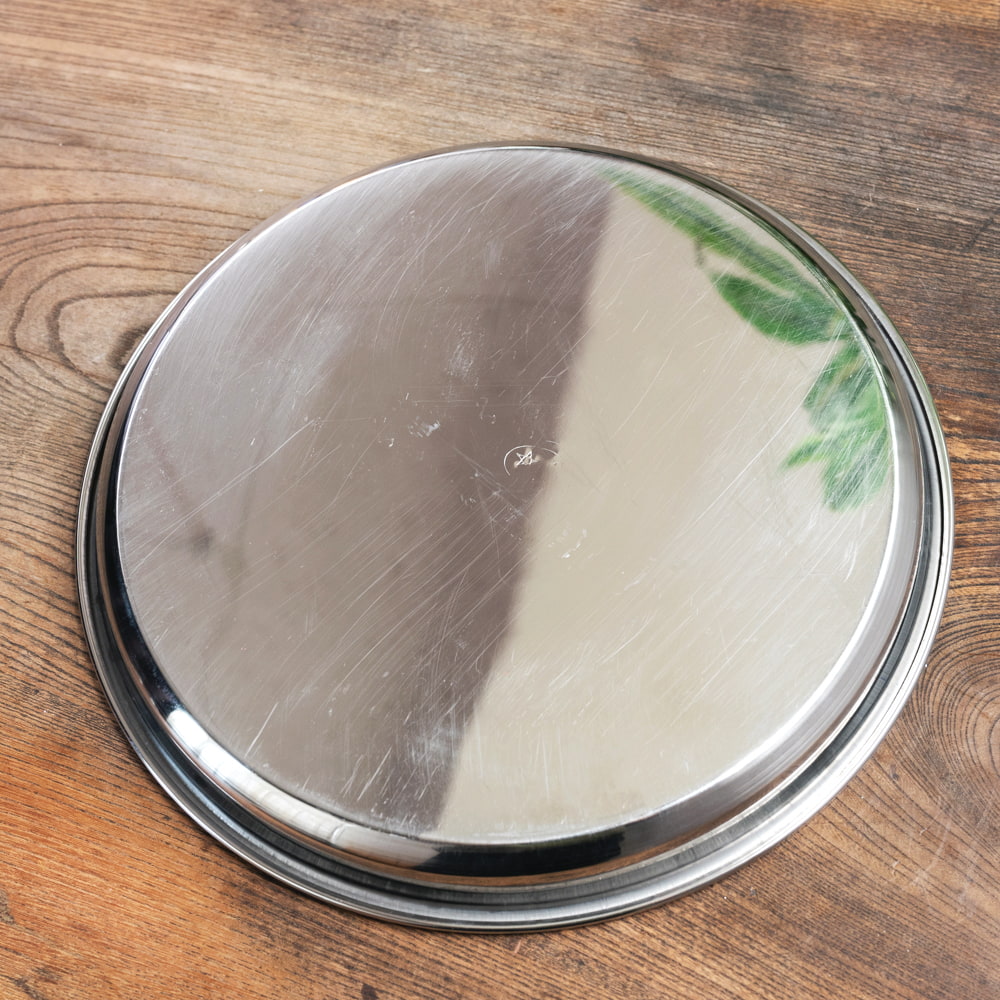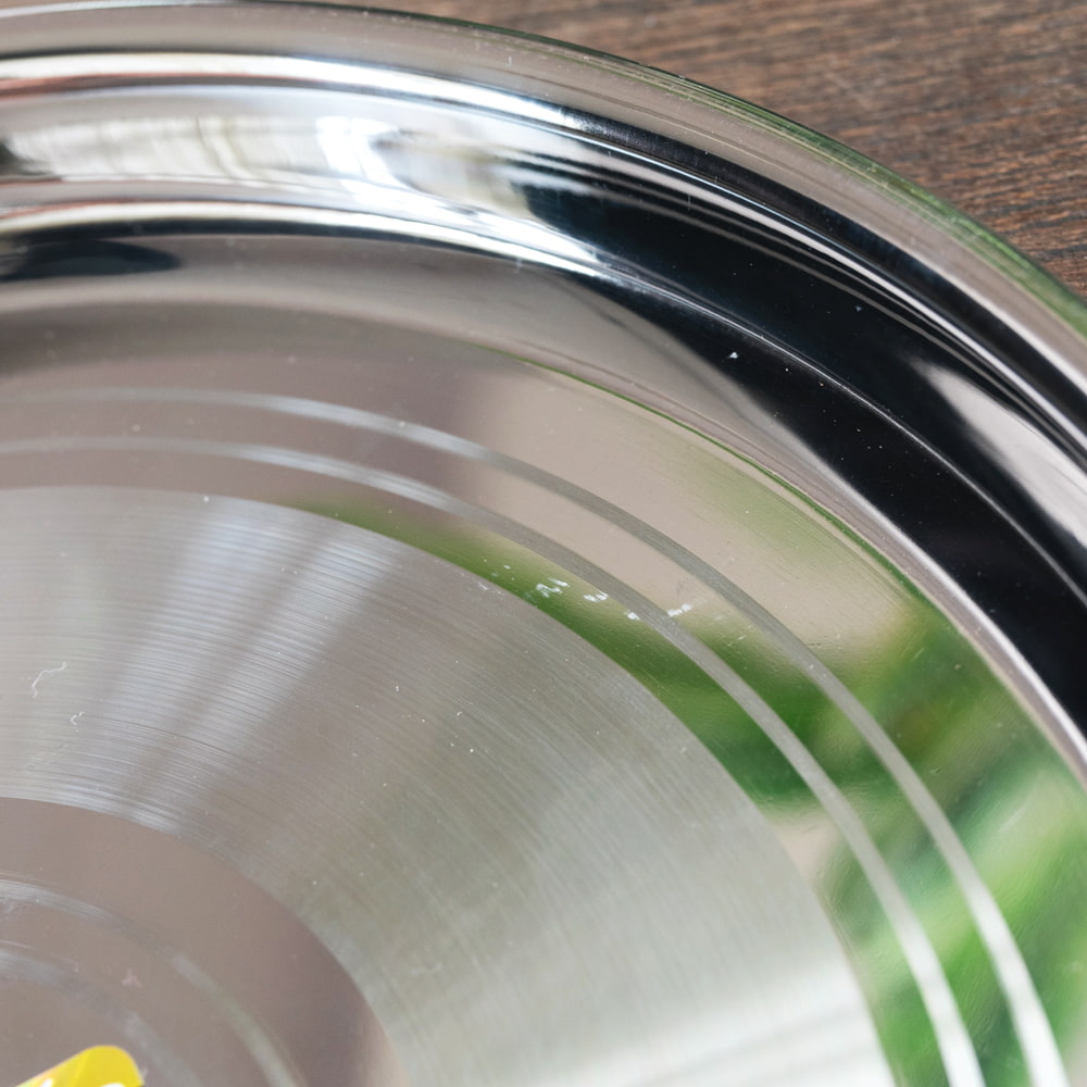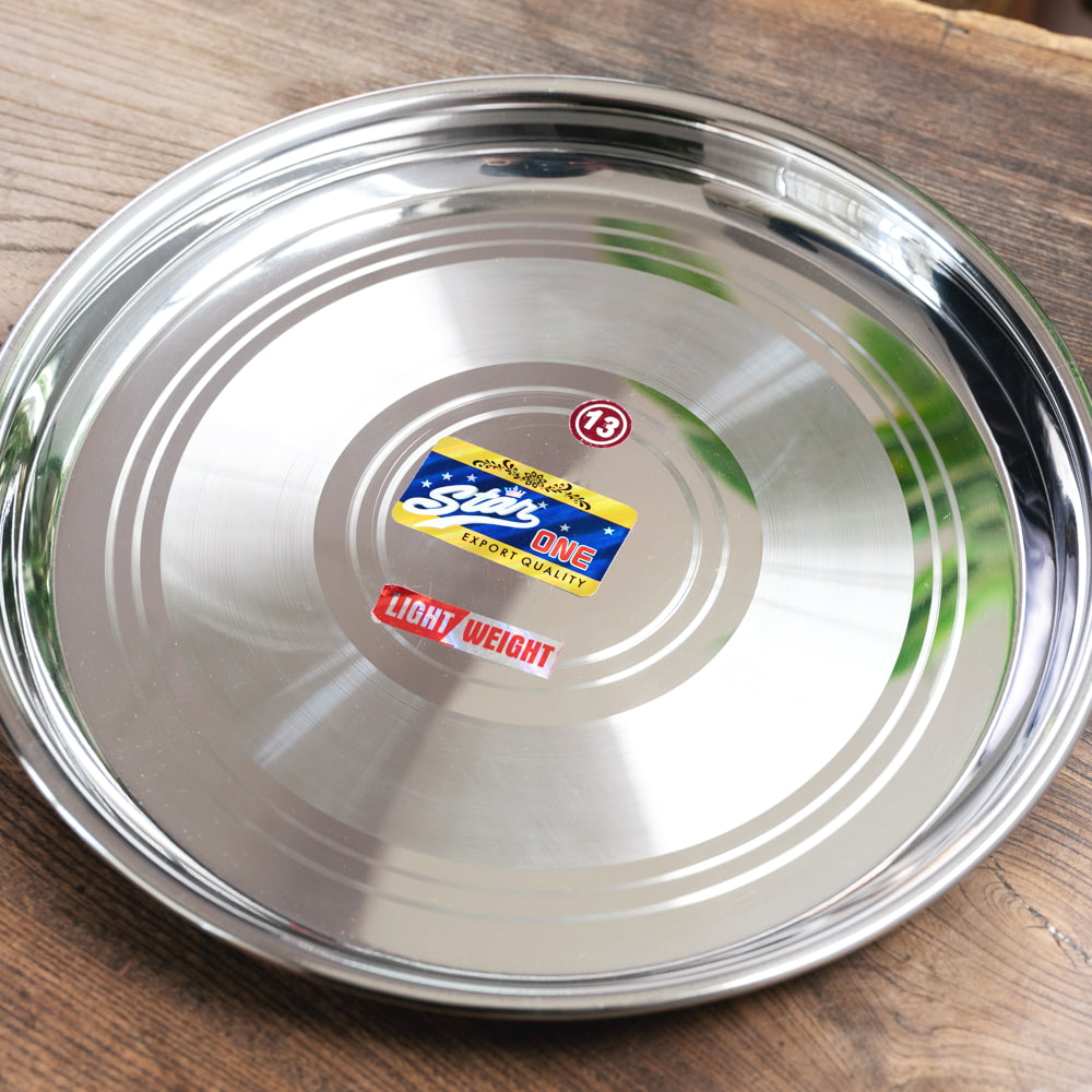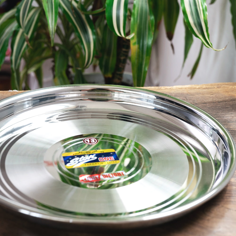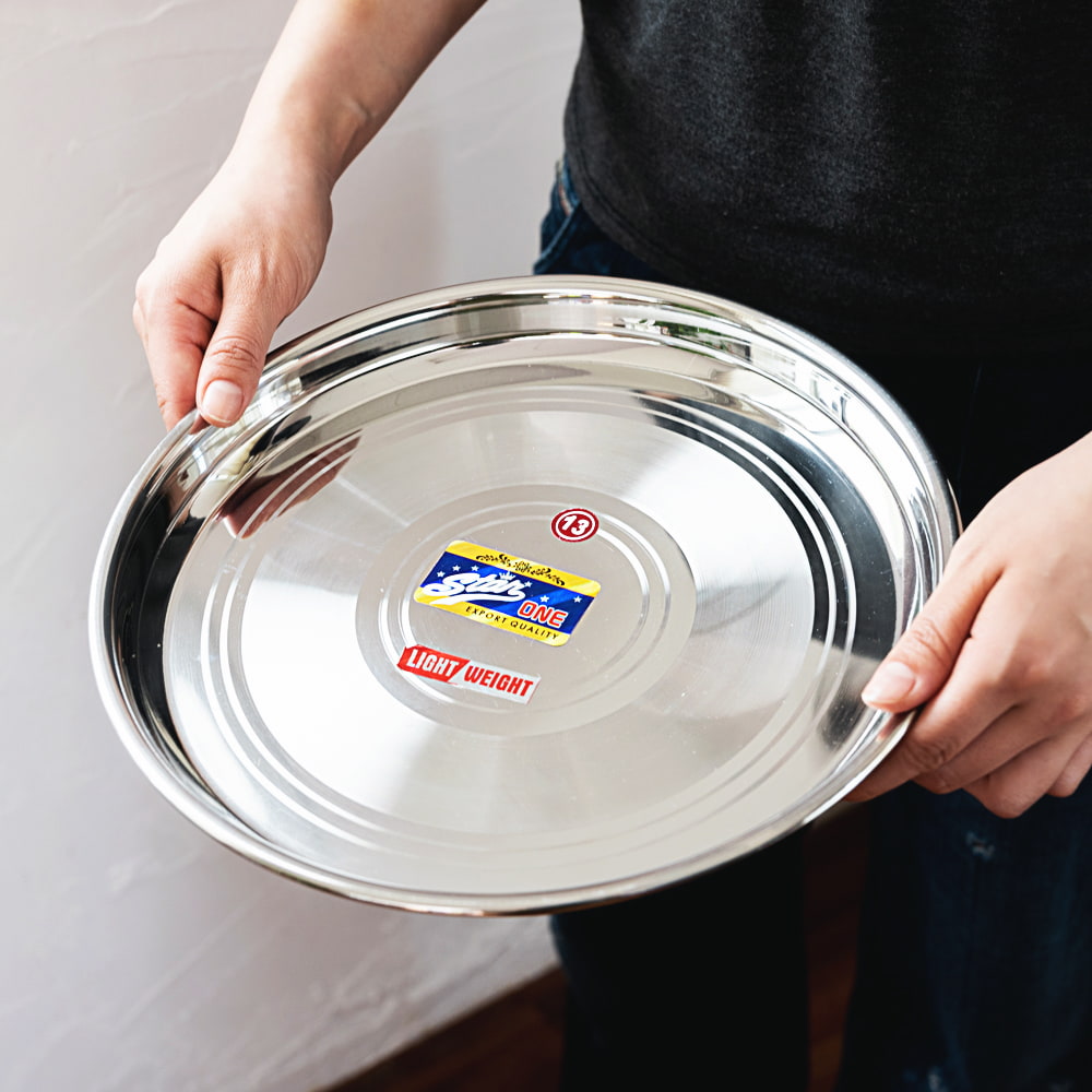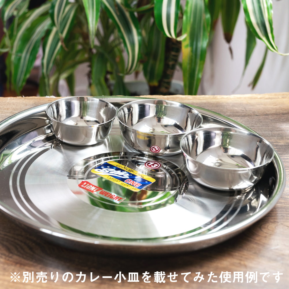 インドでカレーを食べるときに使うステンレス製の大皿。大皿の中にご飯を入れ、小皿の中に数種類のカレーを入れて使用します。うっすらと透かし模様がはいっていてデザイン性も優れた一枚です。陶器の器も魅力的ですが、やはりインド料理といえばステンレス食器!小皿をずらりと並べて色々なカレーを盛り付けるのが本格インド式です。■収納しやすい形です