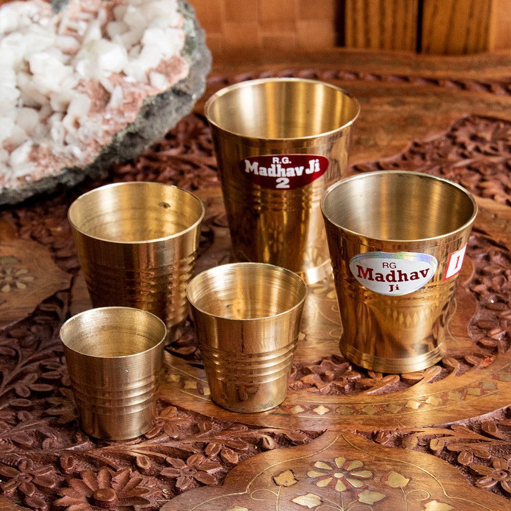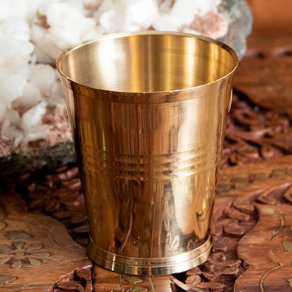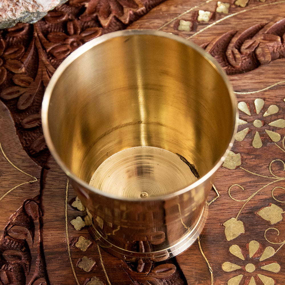 インド現地では礼拝を行う時にガンジス河の水を入れたり、神様への捧げ物の容器として主に使用されるブラスのカップです。古来よりインドではブラスは高級な金属とされ、仏像を作るのに使われたり、宗教用品にはほぼ必ず銅か、ブラスが使われてきました。手のひらに収まる小ぶりな、かわいらしいサイズ感のブラスカップ。模様として入っている横ラインは持つときの滑り止めにもなり、見た目の美しさと実用性を兼ねています。