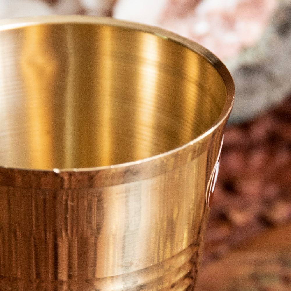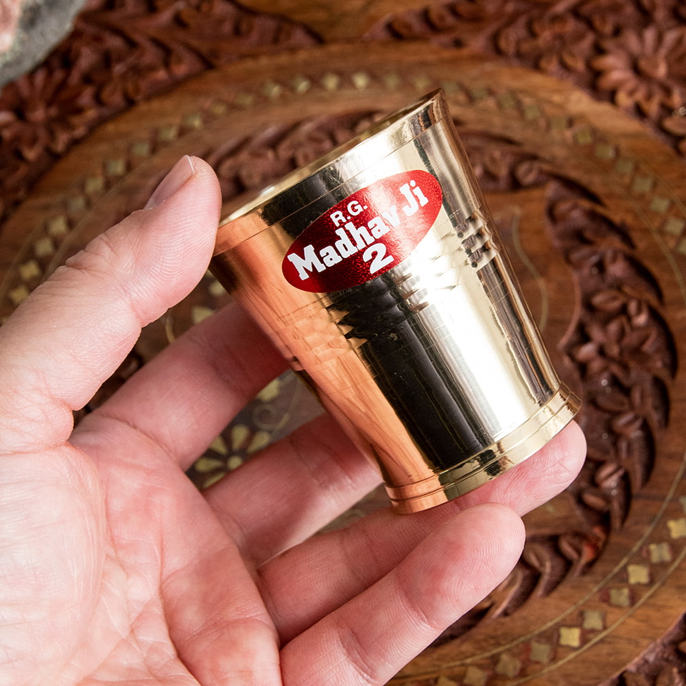 インド現地では礼拝を行う時にガンジス河の水を入れたり、神様への捧げ物の容器として主に使用されるブラスのカップです。古来よりインドではブラスは高級な金属とされ、仏像を作るのに使われたり、宗教用品にはほぼ必ず銅か、ブラスが使われてきました。手のひらに収まる小ぶりな、かわいらしいサイズ感のブラスカップ。模様として入っている横ラインは持つときの滑り止めにもなり、見た目の美しさと実用性を兼ねています。