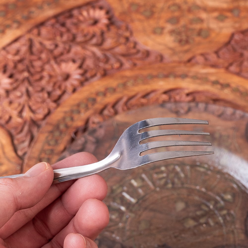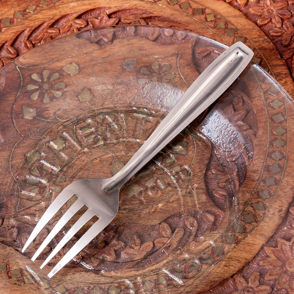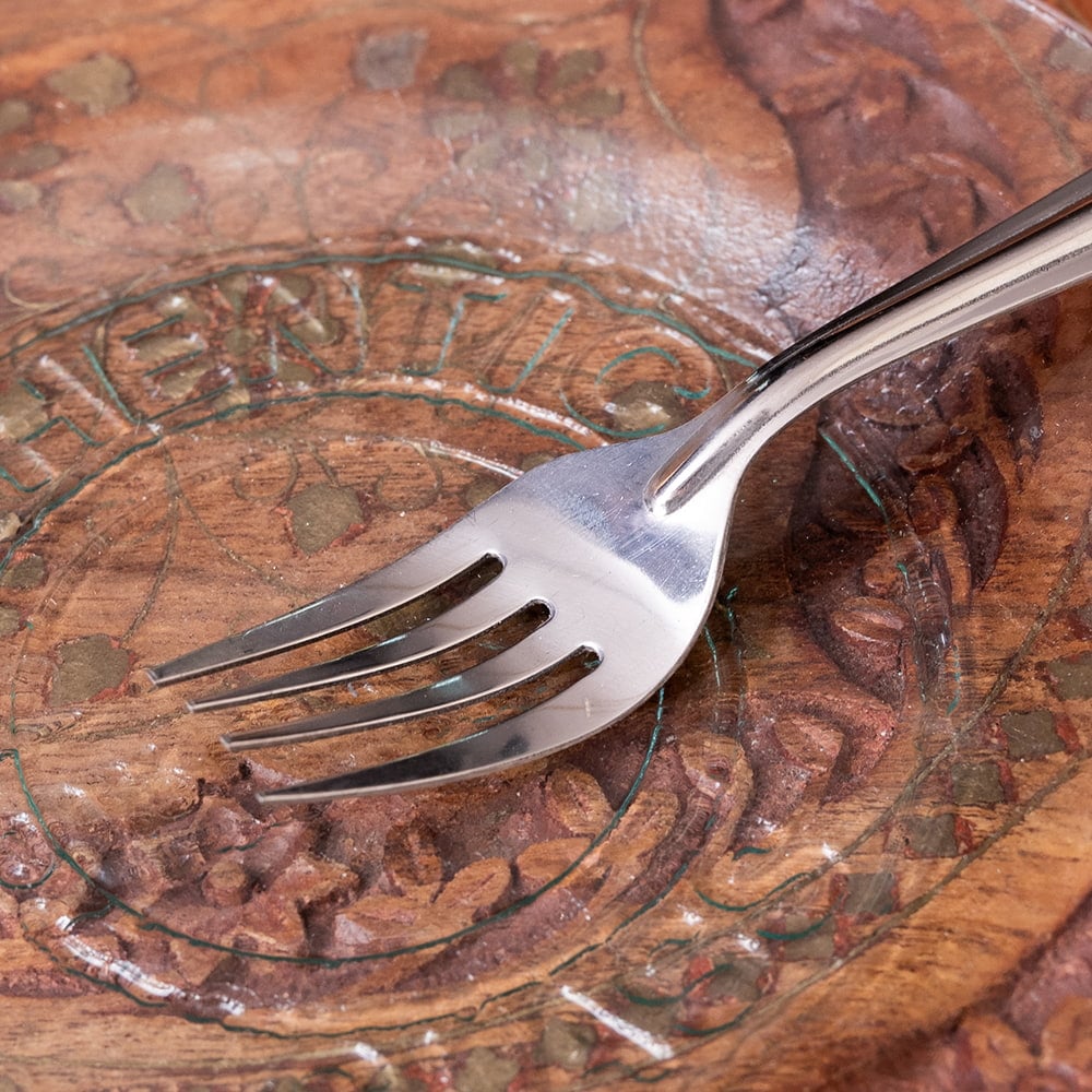 すこし小ぶりでかわいいインド製のフォーク。全長15.5cmと一般的なテーブルフォークよりやや小さめなサイズ感が、どこか愛らしいです。その絶妙なサイズは、デザート用としてはもちろん、前菜や軽食、普段のお食事用のカトラリーとしても活躍してくれます。インド独特のステンレスの質感と、シンプルながらどこかレトロなデザインが魅力。幅広いシーンでお使いいただけます。
