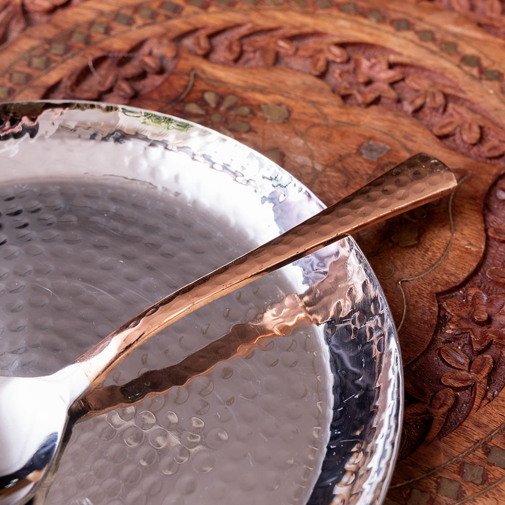 インドでの食事というと、あまりスプーンを使わないというイメージがあるかもしれないのですが、実は色々な場面で使われています。インドのインド料理店でも使ってるスプーンがこちら。ステンレスのスプーン持ちて部分に槌目加工を施したカッパー加工が施され、重量感と高級感がある特別なスプーンとです。高級感があると言ってもインド製品ですので、完全につるんとした感じではありませんが、それもまた魅力的な所ですね。その分より現地の生活感をありのままに感じられるはずです。なお、使用する前に必ず良く洗ってからお使いください。