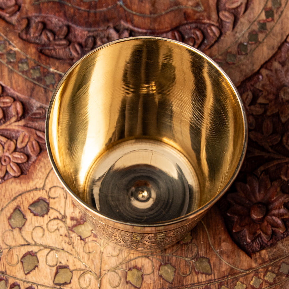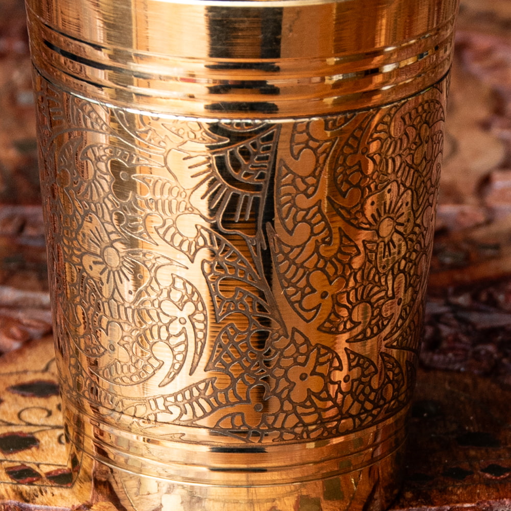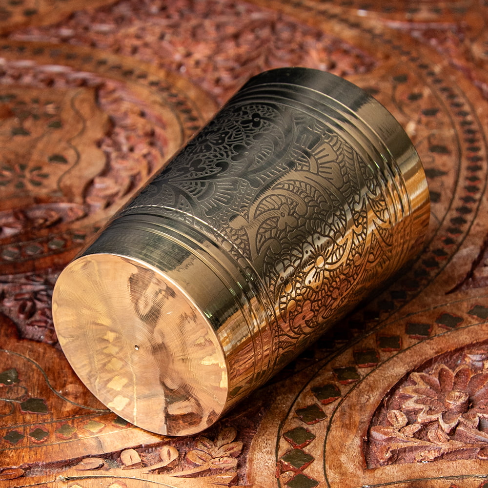 インドの雑貨屋さんで見つけたブラスのコップです。ずっしりとしたしっかりした素材の真鍮に細かな彫り込みがされた高級感のある一品。インドの食器はステンレスや銅製のアイテムが良く知られていますが、こういったブラスの食器もまた違った趣があって素敵ですね。ビリヤニを作った日など、特別な料理と共にぜひ食卓に並べたくなるコップです。ウォーターグラスとしての他にお酒を注ぐのにもオススメですね。