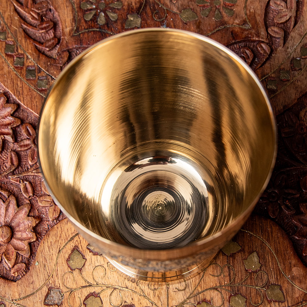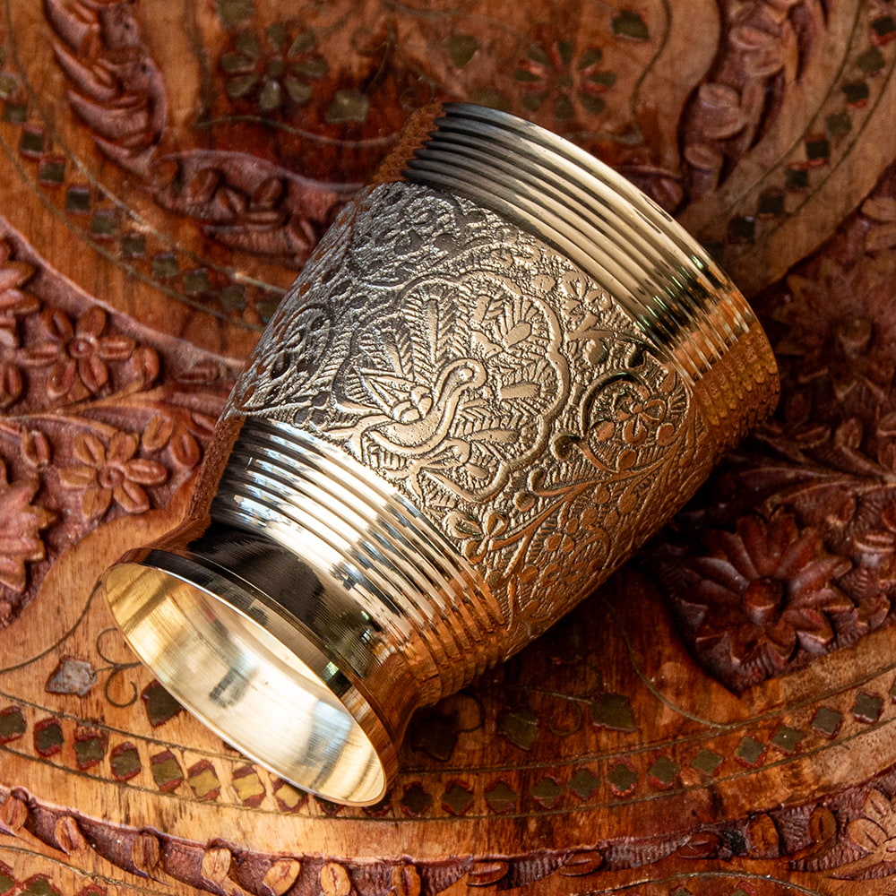 インドの雑貨屋さんで見つけたブラスのコップです。ずっしりとしたしっかりした素材の真鍮に細かな彫り込みがされた高級感のある一品。インドの食器はステンレスや銅製のアイテムが良く知られていますが、こういったブラスの食器もまた違った趣があって素敵ですね。ビリヤニを作った日など、特別な料理と共にぜひ食卓に並べたくなるコップです。ウォーターグラスとしての他にお酒を注ぐのにもオススメですね。