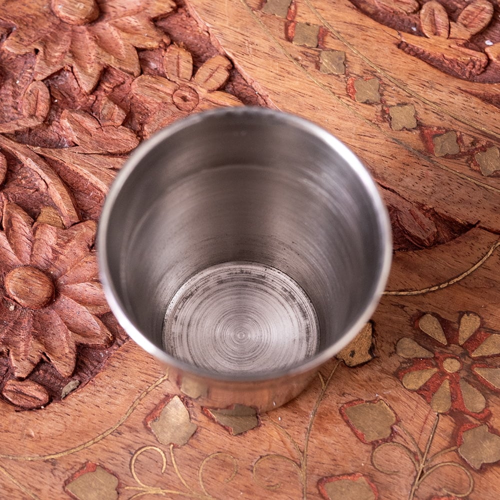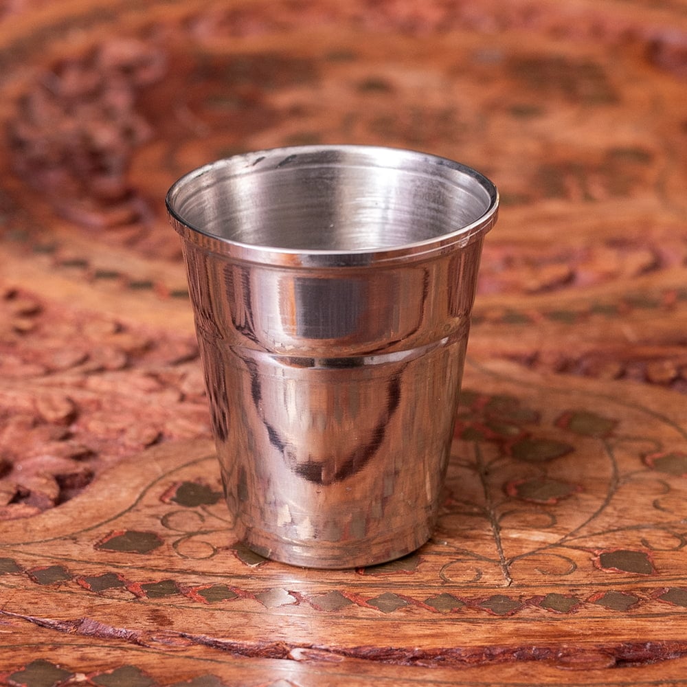 ステンレスで出来たコーヒー・チャイカップです。ショットグラスサイズで、一口分飲むのに良いサイズ感。一般的なチャイカップの子どもといった大きさで、ころっとしたかわいいやつです。インドでは、プージャ用として神様へのお供えを入れる為の、プージャグラスとしても使われています。