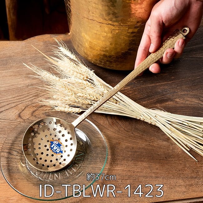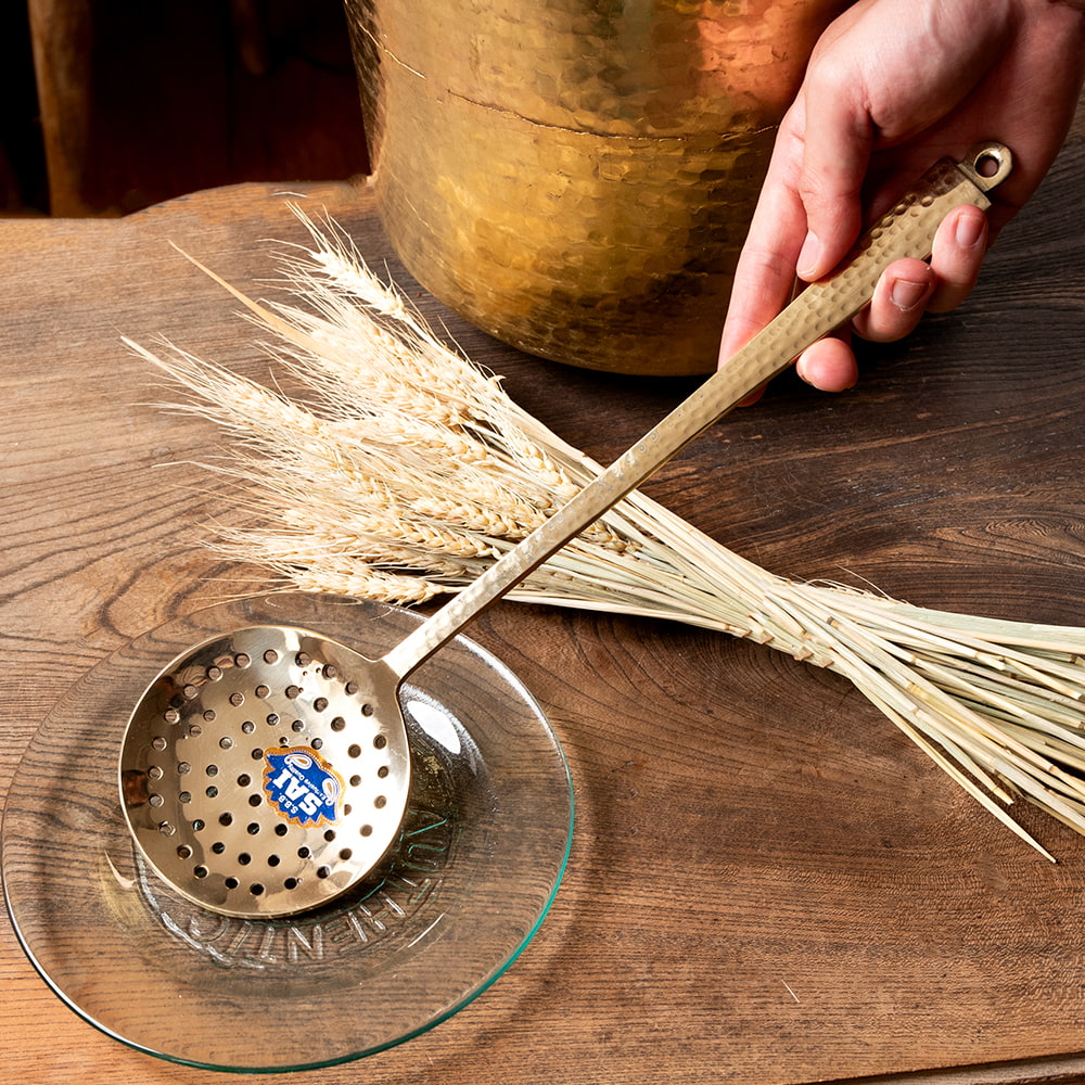 日本では中々お目にかかれない、真鍮製の調理器具です。おたま…というには深さがやや物足りませんので、炒めもの時に使ったり、料理を取り分けたりするのに良さそうなサイズ感になります。インドでは、「パニプリ」を揚げた時に油の中からすくい出す時に使っています。