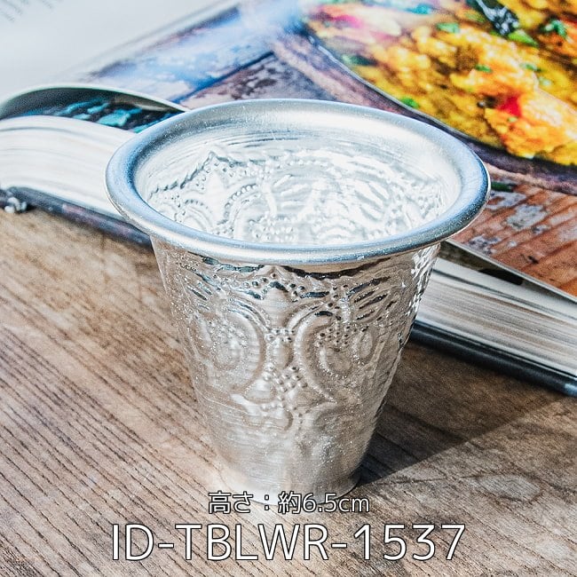 インド伝統唐草エンボスの アルミ ミニコップ【高さ:約6.5cm】(ID-TBLWR-1537)の写真です