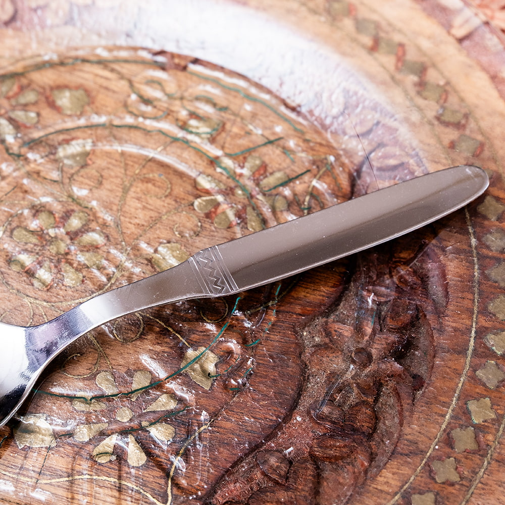インドでの食事というと、手で食べるイメージが強いかもしれませんが、実はスプーンも日常的に使われています。そんな現地で実際に使われているスプーンを、6本セットでお届けします。インドらしい素朴なつくりで、ところどころに見られる小さな凹みや製造時の跡などが、現地の暮らしの空気を感じさせてくれます。きっちり整った仕上がりとは違った、ラフで味わいのある表情をお楽しみください。ご使用の際は、念のためよく洗ってからお使いください。