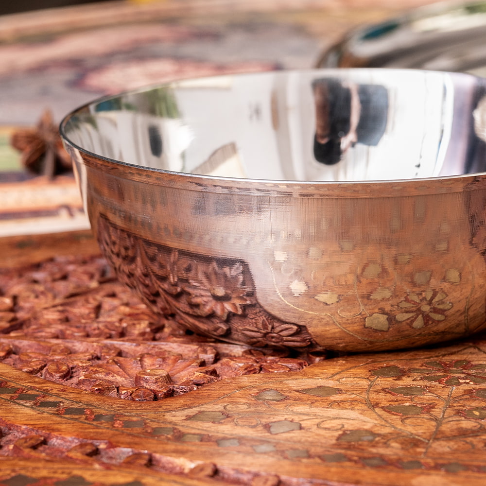 インドでカレーを食べるときによく使われるステンレス製のカトリ。一般的にはより小さめの物が使われていますが、こちらは大きめの取り分け用サイズです。特に、人数が多いときや、おもてなしの場での取り分け皿としても大活躍。たっぷりとサブジやダールなどを入れて、シェアできるのが良いですね。他にも、骨付きのチキンマサラやフィッシュマサラ、タンドリーチキンをたっぷり盛り付けて、みんなでシェアすれば、まるで現地の食卓を楽しんでいるような気分に!また、ライスやビリヤニを入れても十分な容量があり、シェア用のサービングボウルとして便利です。