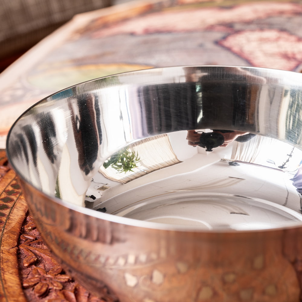 インドでカレーを食べるときによく使われるステンレス製のカトリ。一般的にはより小さめの物が使われていますが、こちらは大きめの取り分け用サイズです。