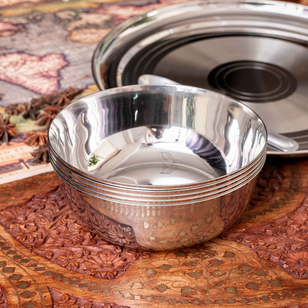 インドの暑い気候でもステンレス製の食器は衛生的で清潔に保てるため、非常に重宝されています。ステンレスは丈夫で臭い移りも少ないので、毎日安心して使うことができます。陶器の食器と比べて、割れる心配もなく、軽くて扱いやすいのも魅力です。