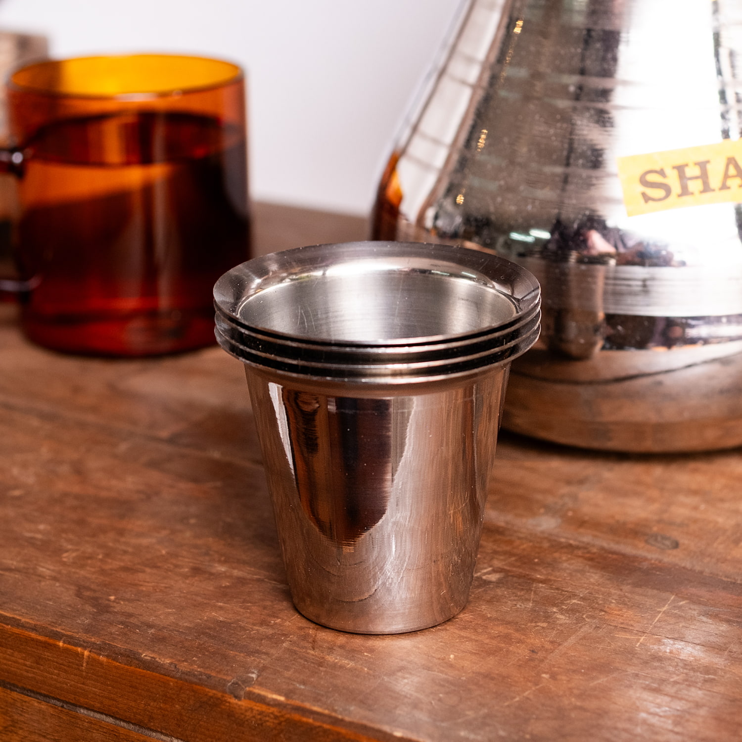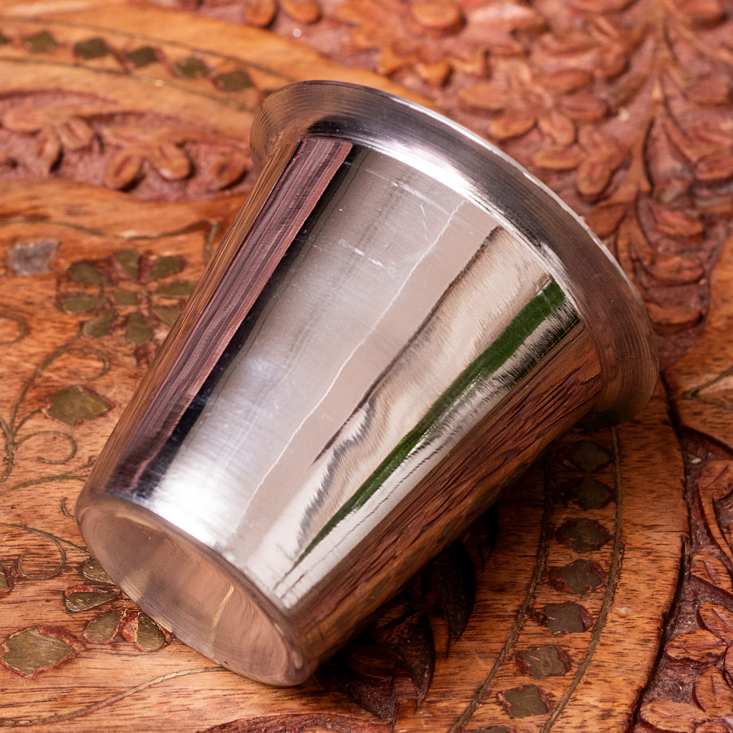 ステンレスで出来たコーヒー・チャイカップです。最大容量約90mlと、大きめのショットグラスサイズで、ちょっと飲むのに良いサイズ感。エスプレッソを入れたりもできそうです。一般的なチャイカップの子どもといった大きさで、ころっとしたかわいいやつです。南インドスタイルで、縁が広がっているのも可愛いポイントです。インドでは、プージャ用として神様へのお供えを入れる為の、プージャグラスとしても使われることがあります。