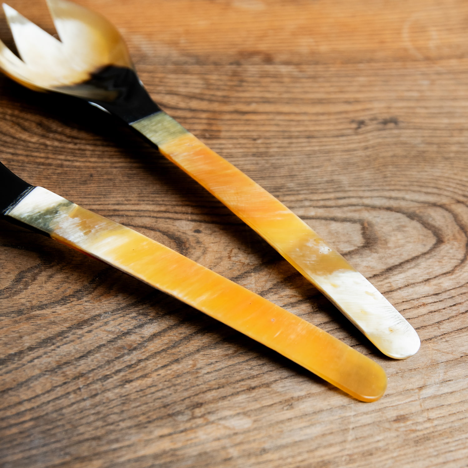 ![【3個セット】水牛の角のサラダサーバー キャトルホーン 美しいべっ甲模様[約25cm×6cm] 5 - 一部分を拡大してみました。こちらはフォークです](https://www.tirakita.com/food3/Photos/set_food_1708_5b.jpg)