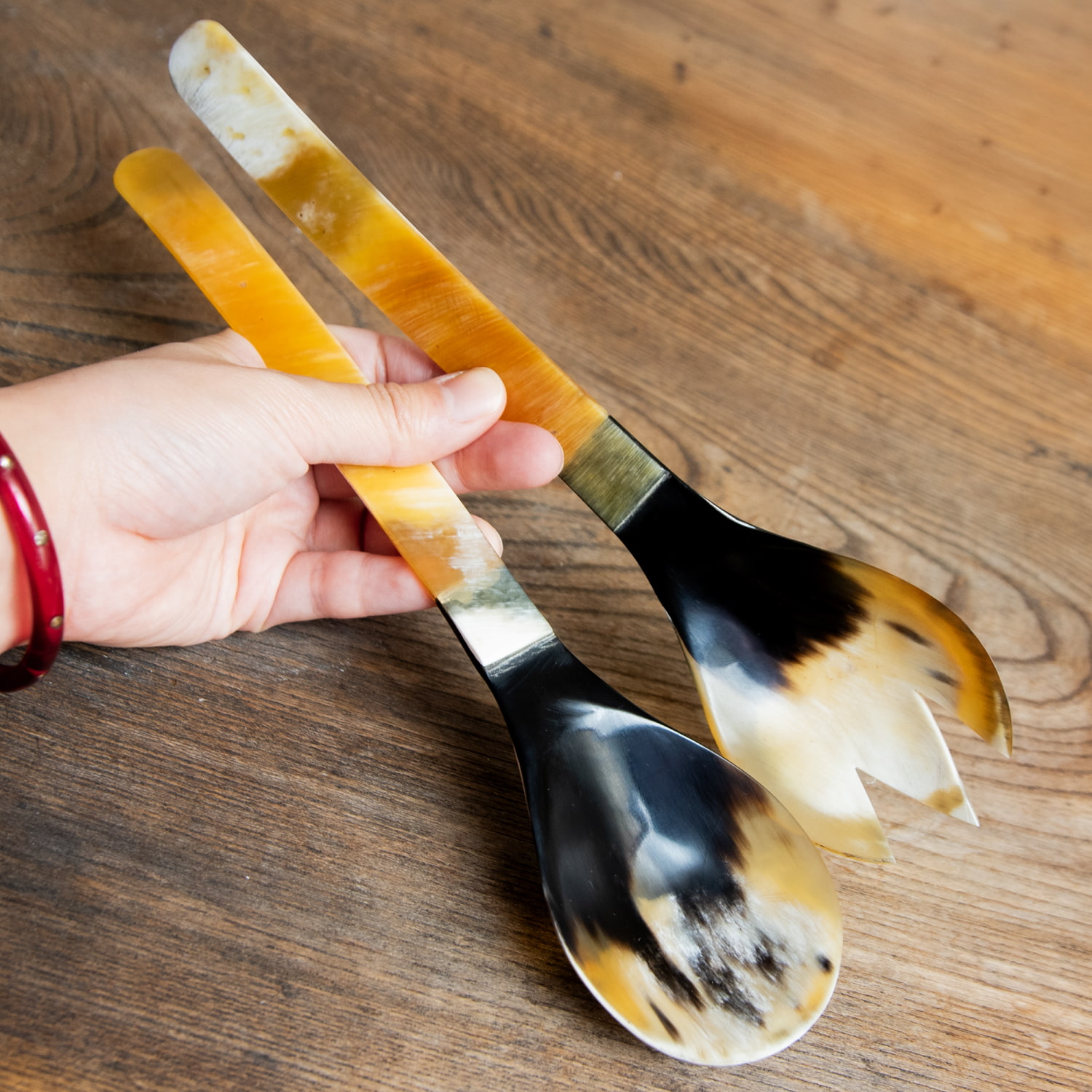 こちらは大きなスプーンとフォークが一組になった、便利なサービーング用のカトラリーです。大皿のサラダやおかずなどを取り分ける際に、こんな素敵なサーバーを使えば盛り上がること間違いなし!一気にアジアンな雰囲気が出ますね。自然素材ならではの美しい透明感や、絶妙な硬さの使用感は水牛の角ならでは。水牛の角は口当たり柔らかで、持ち手はゆるやかにカーブしていて手にそって持ちやすくなっています。ぜひ、アジアンな食卓に合わせてお使いください。