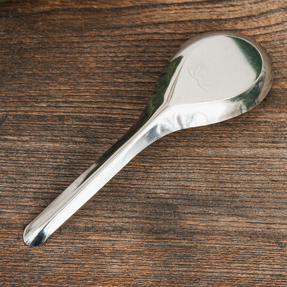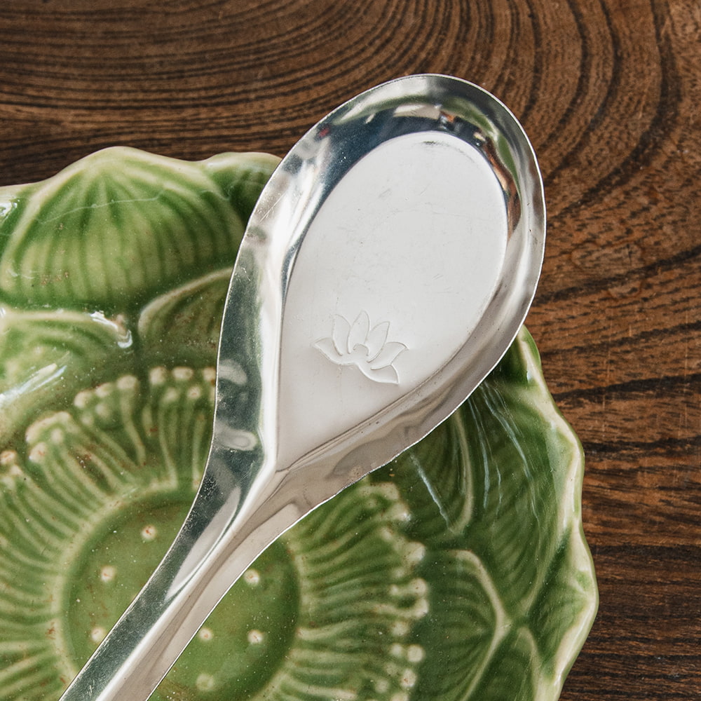 こちらは、さり気なく刻印されたロータス模様がかわいいレンゲです。フランスの影響が名残をのこすベトナムでは、西洋とアジア双方の料理が融合しています。ハーブをふんだんに用いた香り高い料理が特徴的ですが、「フォー」や「ブン」といった麺類はとりわけ名高いです。旨味の効いたスープに、優しい舌触りの米麺が組み合わさって日本人にも嬉しい美味しさです。こちらのレンゲはそんなベトナムで日常的に用いられているアイテムです。スープ状の食べ物が多いベトナムならではの食器ですね。小さな刻印も可愛らしく、普段使いにもぴったりです。